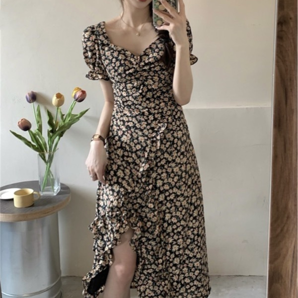 | nameOriginal | 2024 Summer Holiday Style French V-neck Floral Dress Korean Style Elegant Slim-fit Bubble Sleeve Chiffon Split dress |
