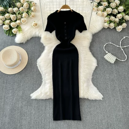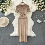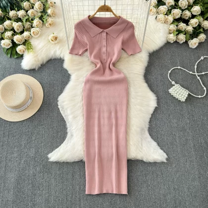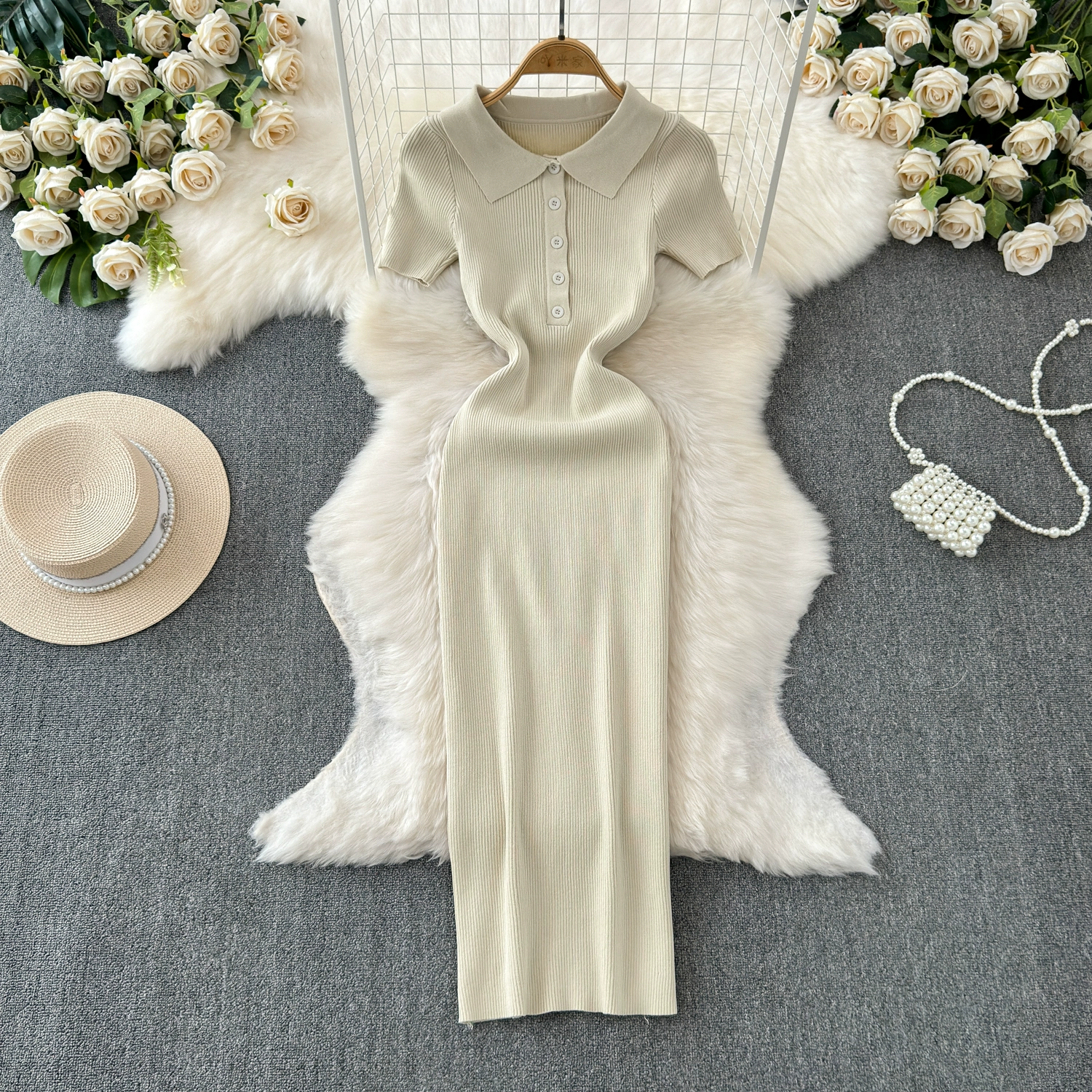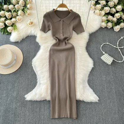 | nameOriginal | 2024 summer Korean new style elegant retro temperament short-sleeved Polo collar waist slimming knitted hip dress |