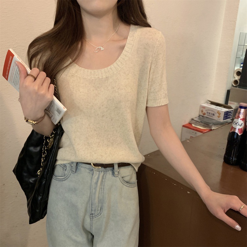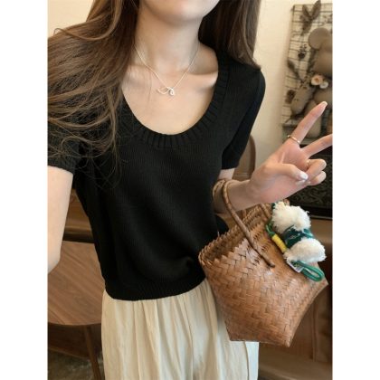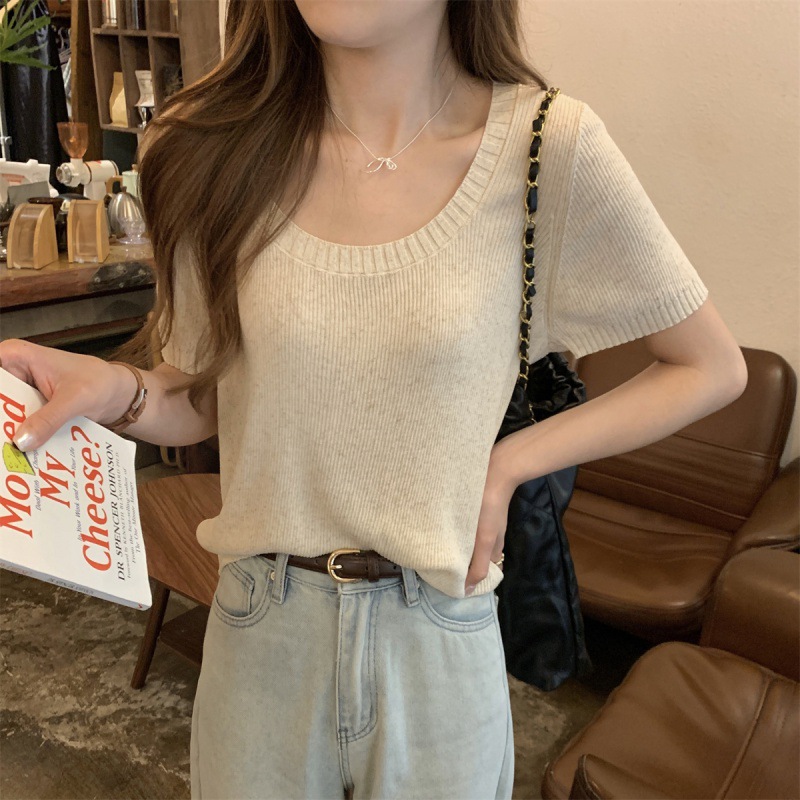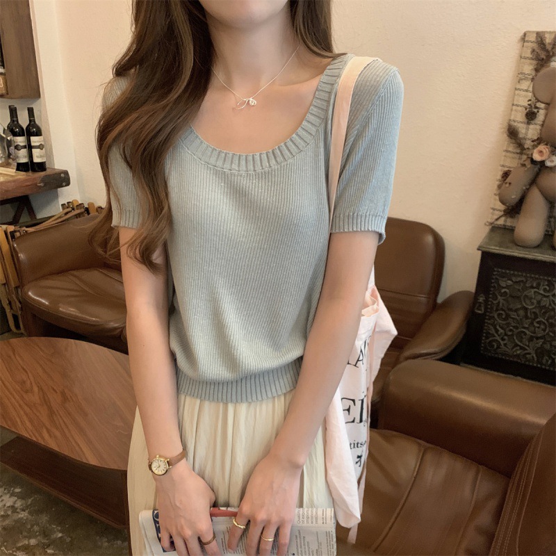 | nameOriginal | 2024 Summer Korean Style Loose Square Collar Elegant Linen All-match Pullover Knit Short-sleeved Top for Women |