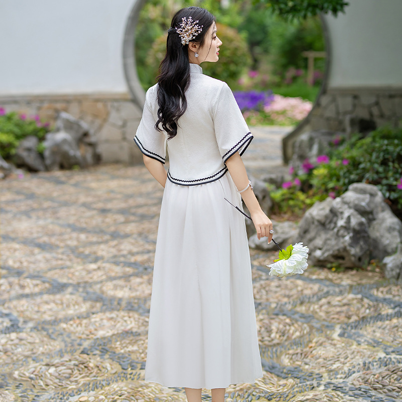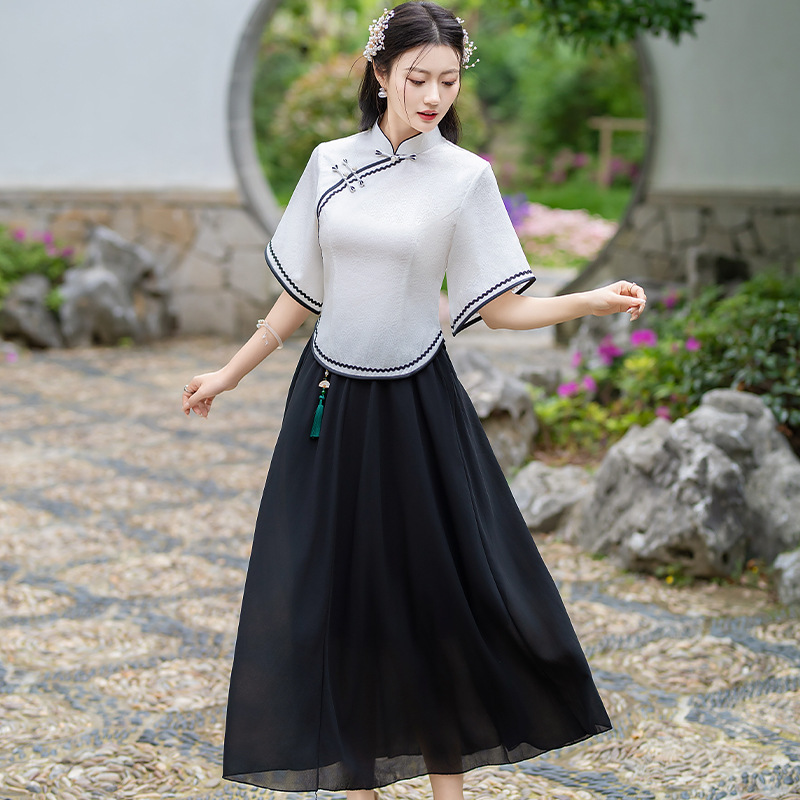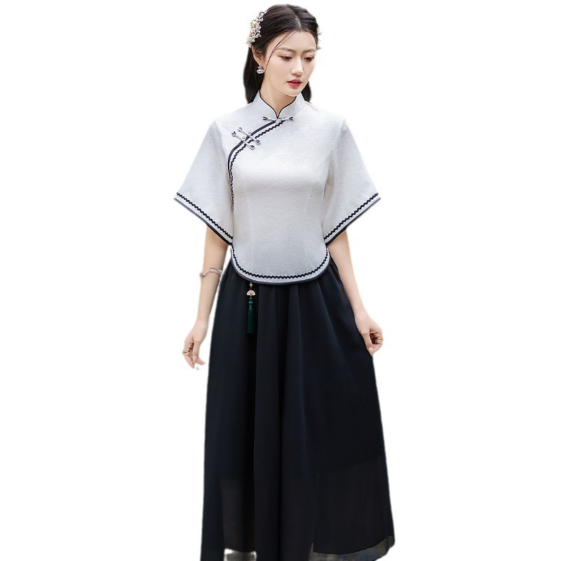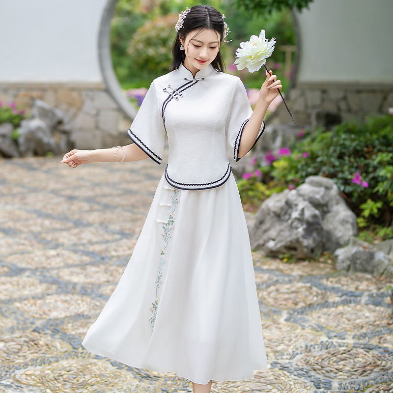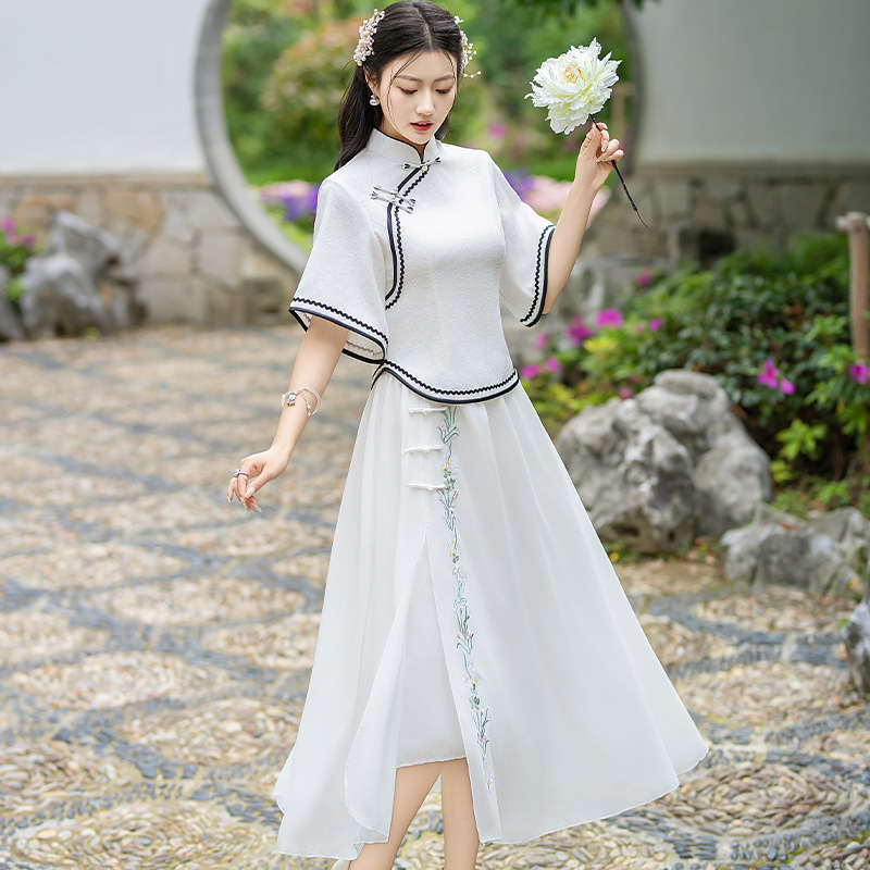 2024 Summer New Arrival Ancient Costume Chinese Style Cheongsam Inverted Big Sleeve Top Chiffon Embroidered Skirt Hanfu Two-Piece Set