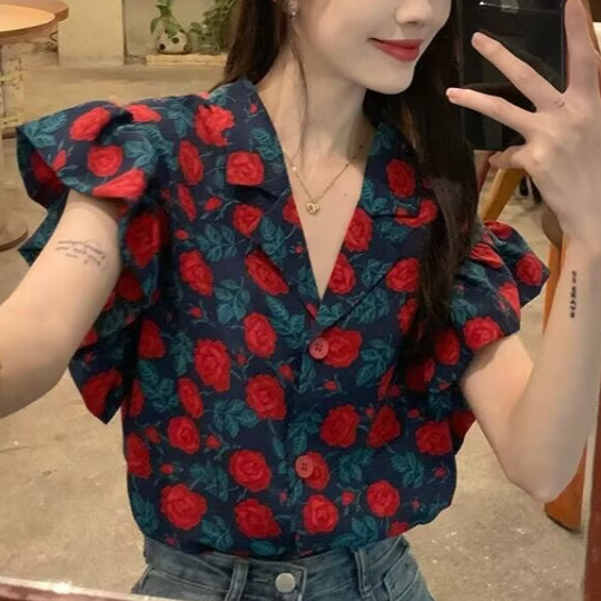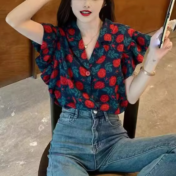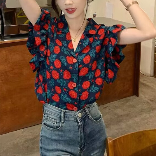 | nameOriginal | 2024 Summer New Arrival Dress Collar Hong Kong Style Flower Shirt Women's Retro Loose Elegant Ruffled Small Flying Sleeve Top for Summer |