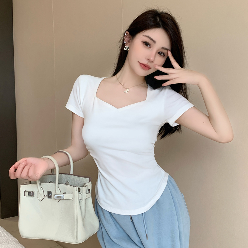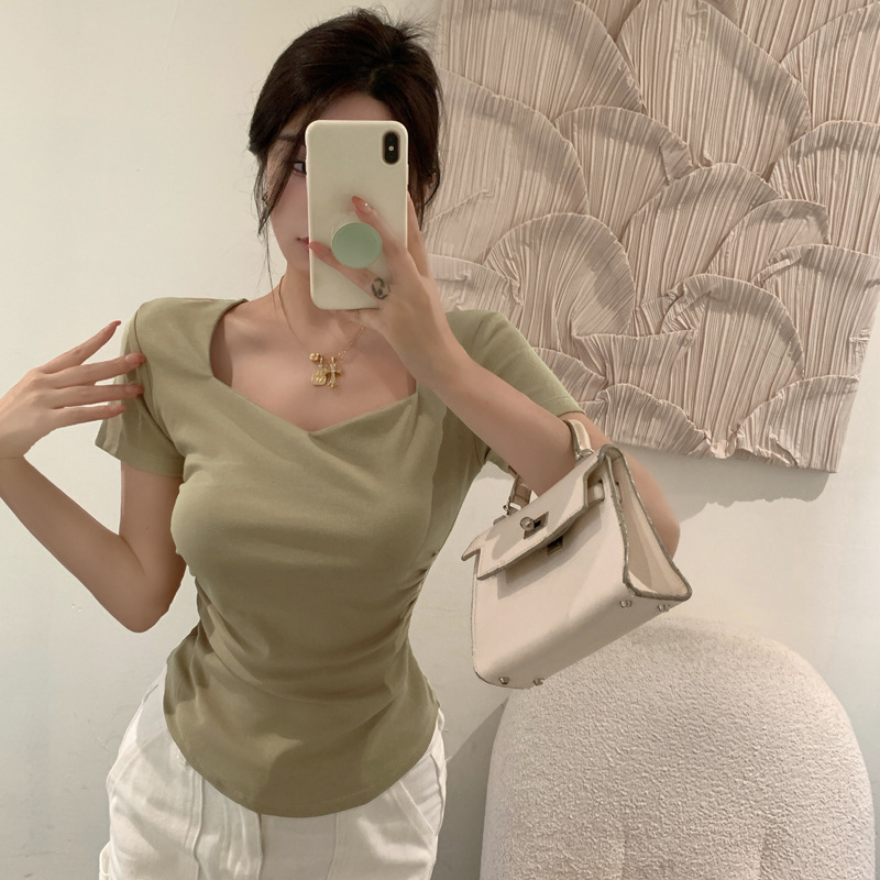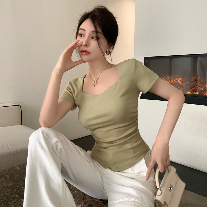 | nameOriginal | 2024 Summer New Arrival Korean Style Elegant Seagull Collar Pleated Design Solid Color Short-sleeved T-shirt Slimming Casual Top |