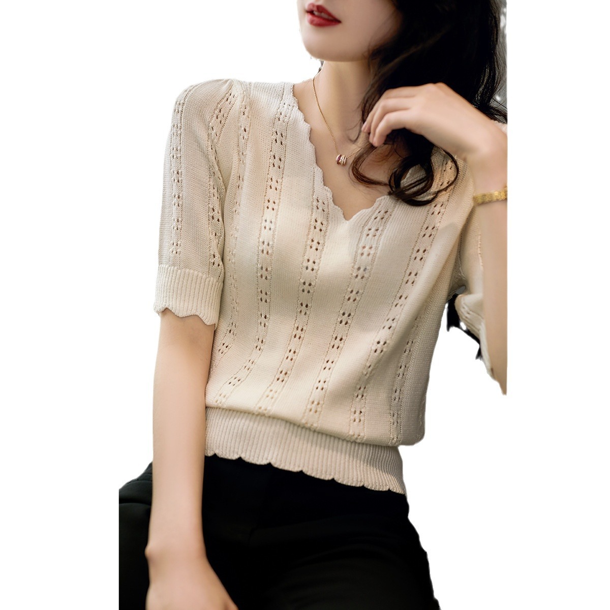 | nameOriginal | 2024 Summer New Arrival White French Style High-Grade V-Neck Hollow Short-Sleeved Knitted Sweater Ice Silk Women's Top T-Shirt Trendy |