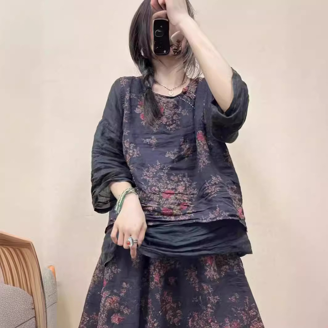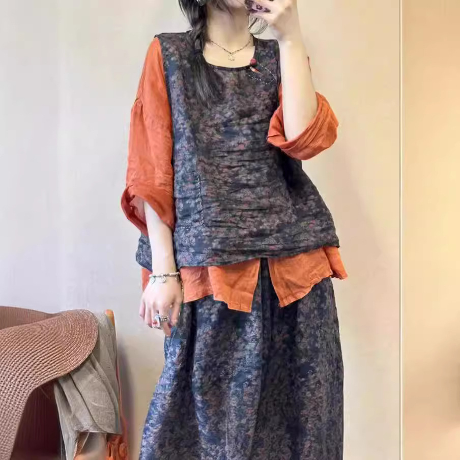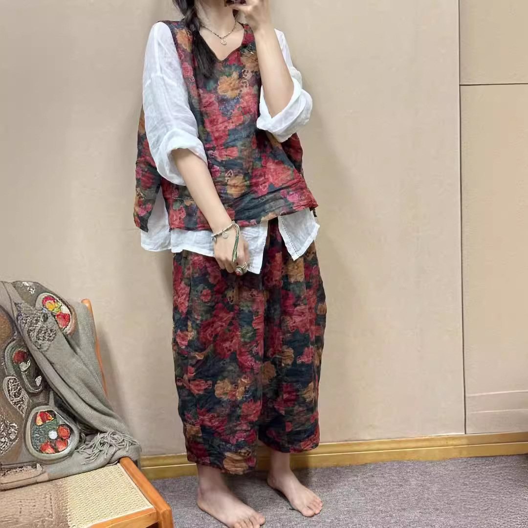 | nameOriginal | 2024 Summer New Artistic Retro Ramie Printed Vest Hallen Pants Elastic Waist Loose Large Casual Trendy |