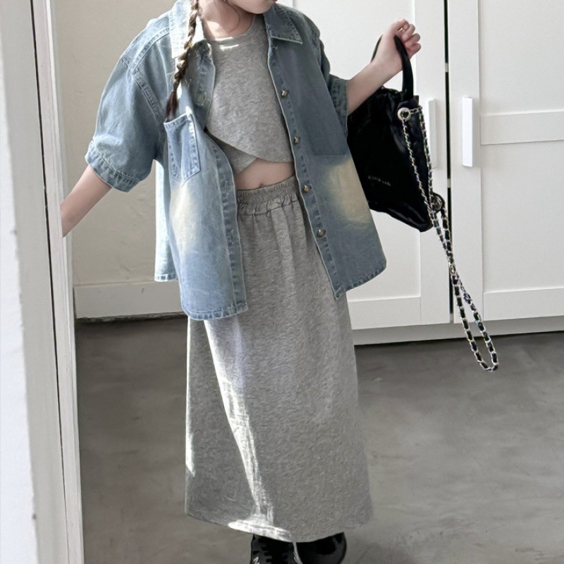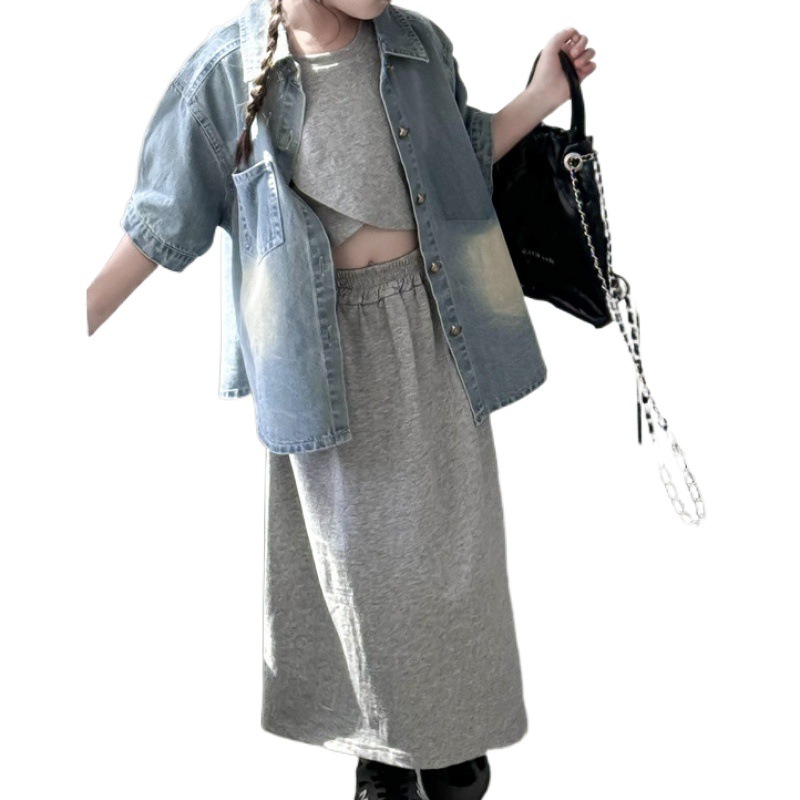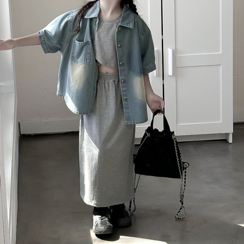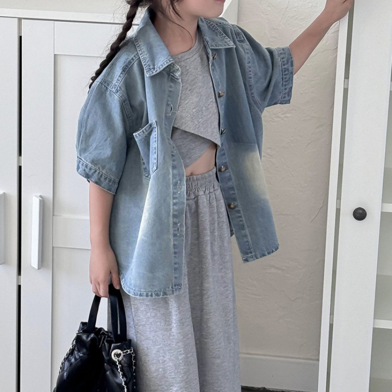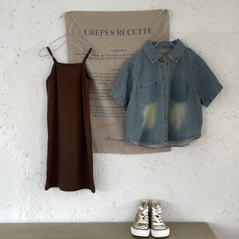 | nameOriginal | 2024 summer new children's clothing boys and girls short sleeve shirt children baby retro polished white gradient denim shirt |