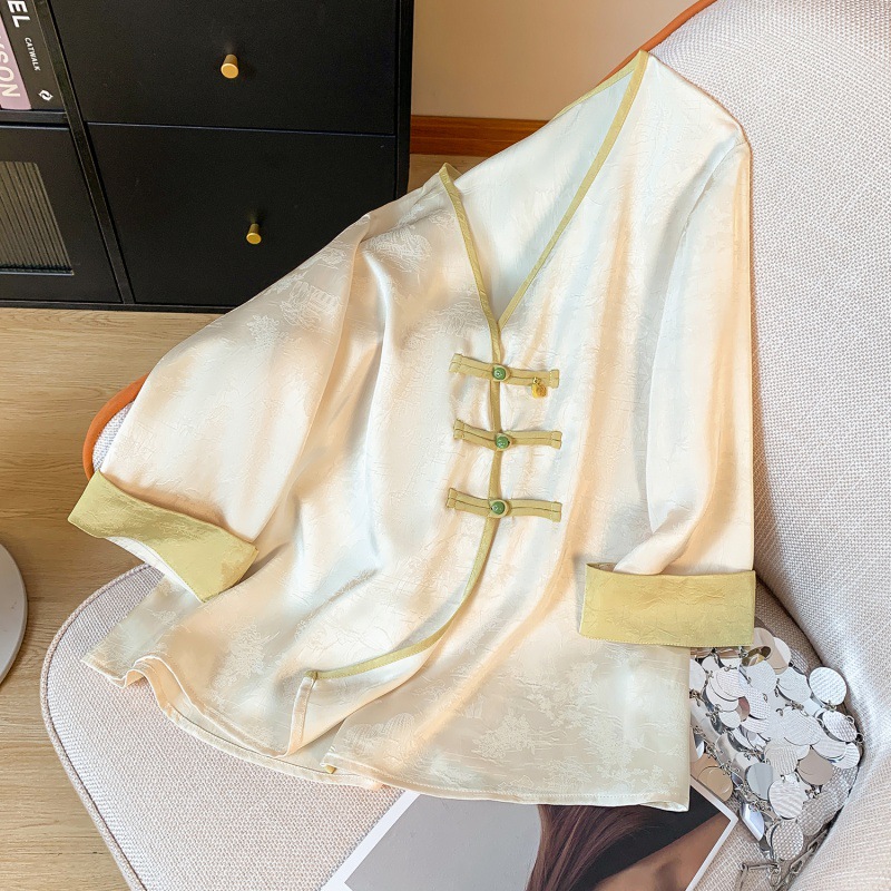2024 Summer New Chinese Style Top Tang Suit Women's Hanfu Zen plus size Vintage V-Neck Buckle Jacquard Tea Suit Small Shirt