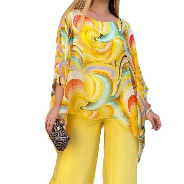 | nameOriginal | 2024 Summer New Color Chiffon suit Casual Round Neck Printed Two-Piece Independent Station Amazon Cross-Border Women |