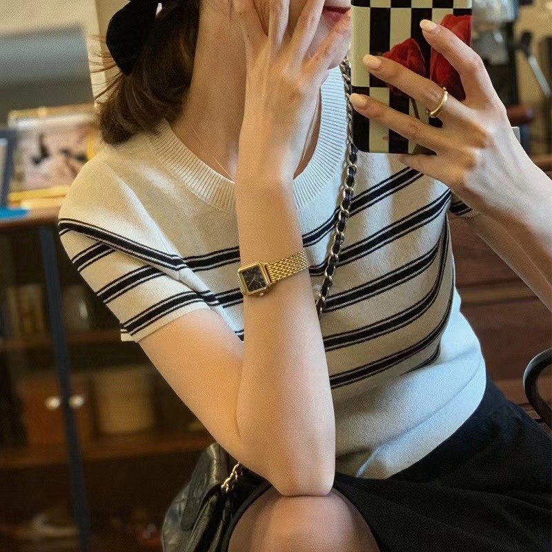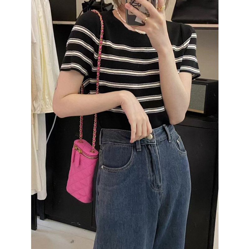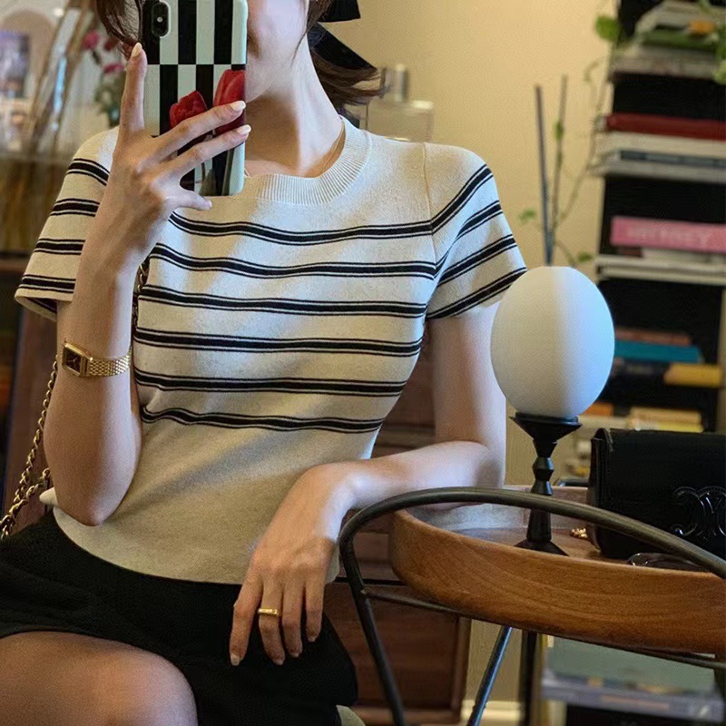 | nameOriginal | 2024 Summer New Color Contrast French Stripe Round Neck Short Women's Slim-fit Short-sleeved Sweater T-shirt |
