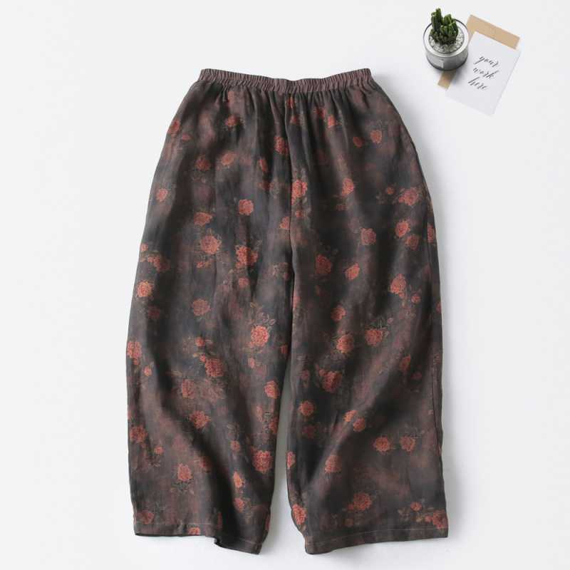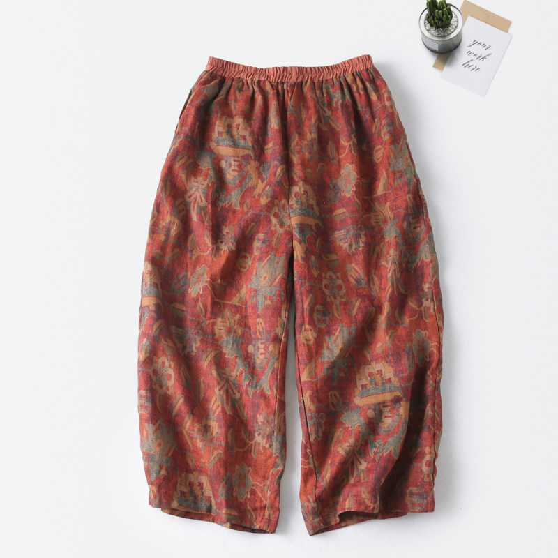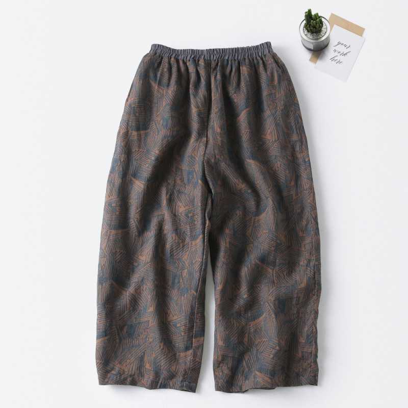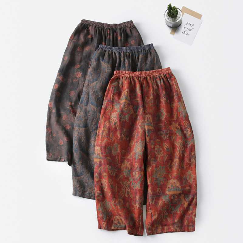 | nameOriginal | 2024 summer new color linen wide leg pants loose elastic waist contrast color linen printed trousers |