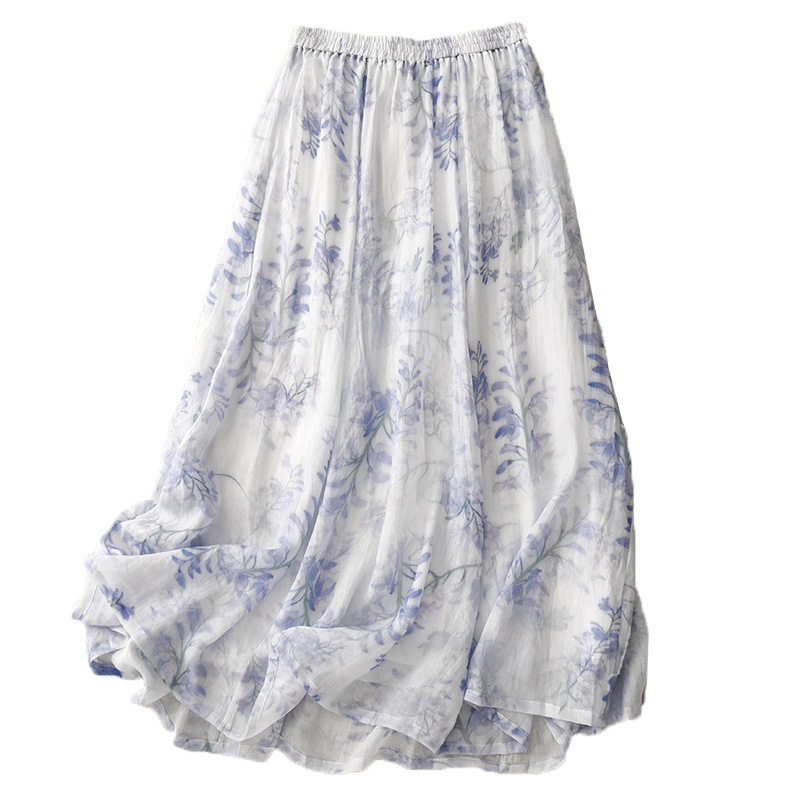 | nameOriginal | 2024 Summer New Cotton and Linen A- line Skirt National Style Printed Mid-length Skirt Loose Waist Slimming Fairy Skirt |