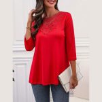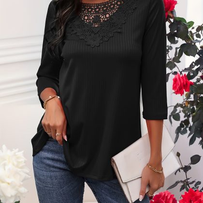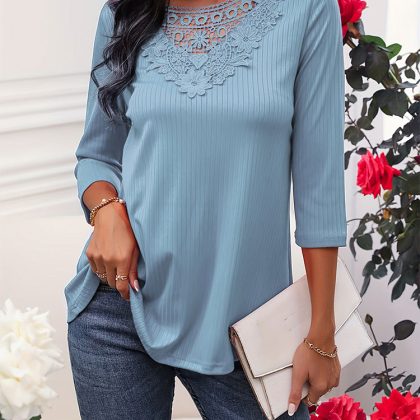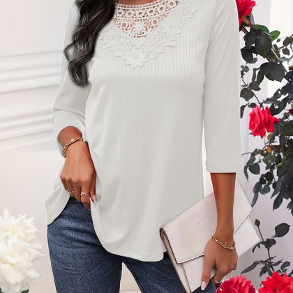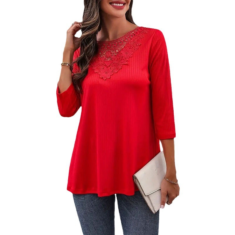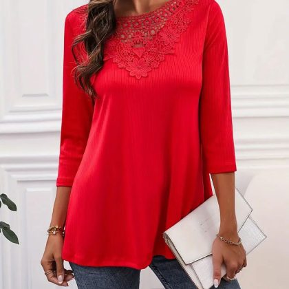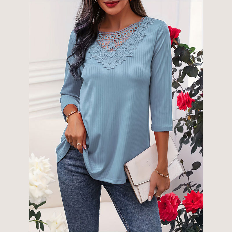 2024 Summer new elegant lace A swing long sleeve lace collar stitching top women’s pit commuter loose T-shirt women