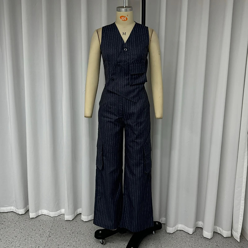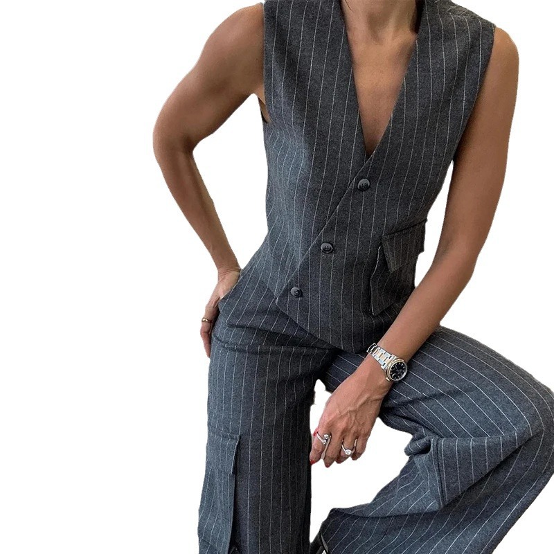 | nameOriginal | 2024 Summer New European and American Amazon Cross-border Women's Striped Side Buckle Vest Elegant Commuter Pants Two-piece Set |