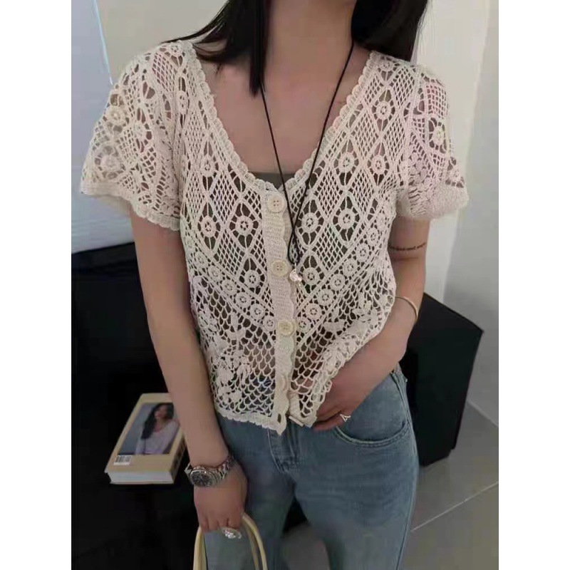 | nameOriginal | 2024 Summer New European-style Socialite Sling Beautiful Back Crochet Hollow Short-sleeved Women's Lace Shirt Top |