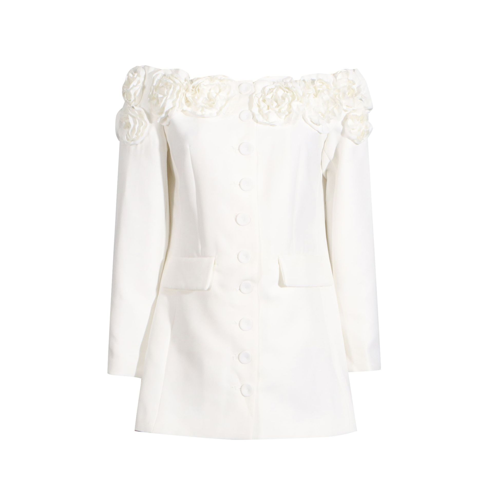 | nameOriginal | 2024 summer new fashion off-shoulder three-dimensional flower pocket stitching design sense single row multi-button short dress |