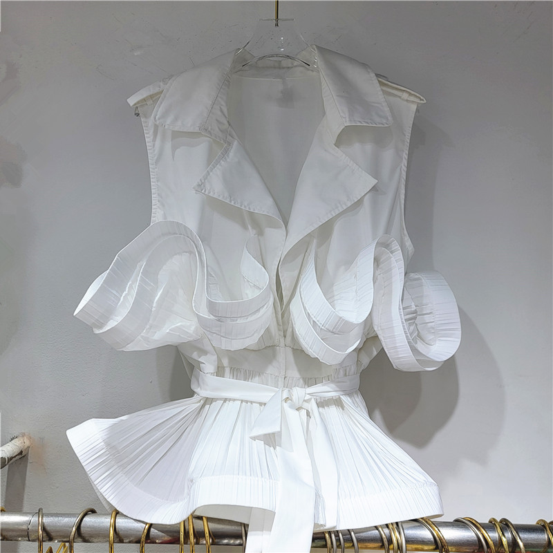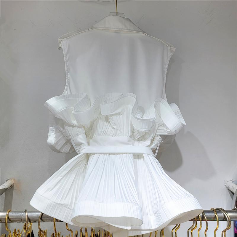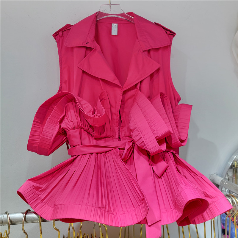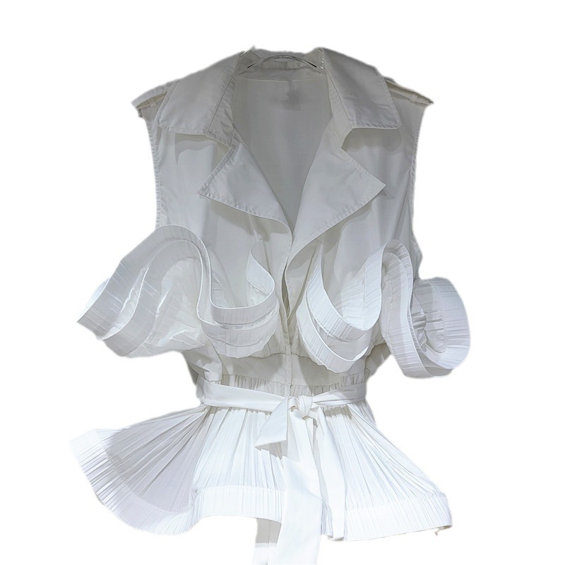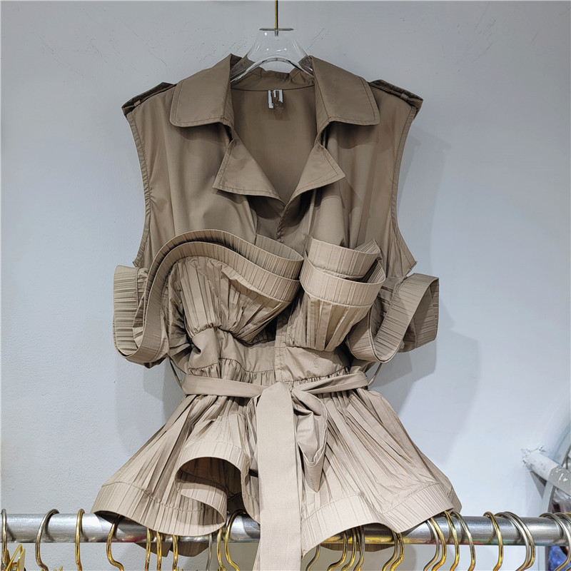| nameOriginal | 2024 summer new fashion temperament khaki V-neck pleated stitching design sleeveless lace-up women's shirt |