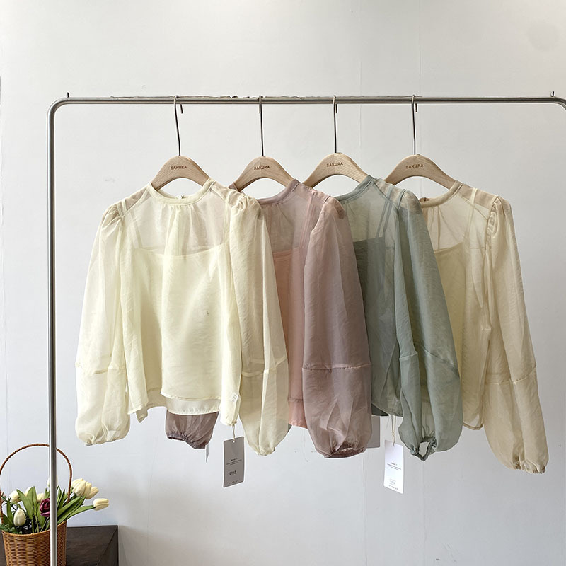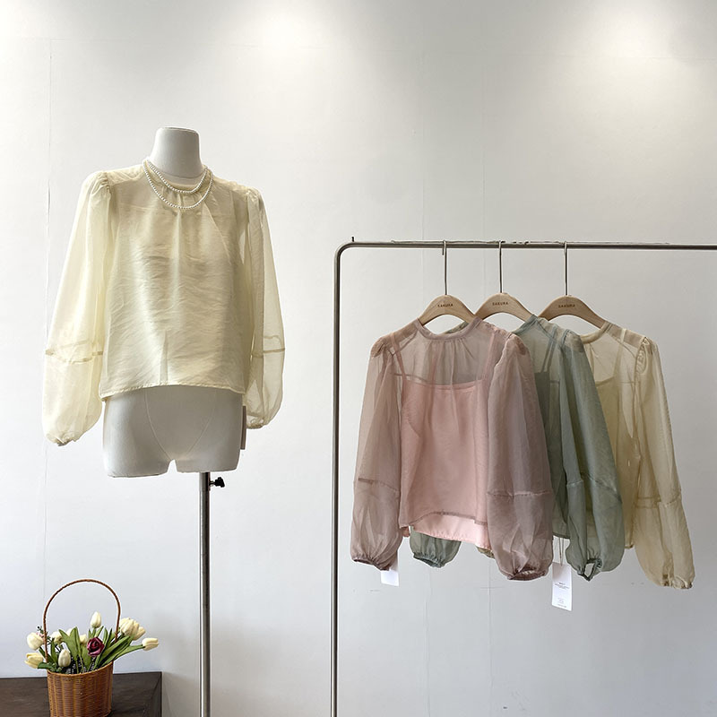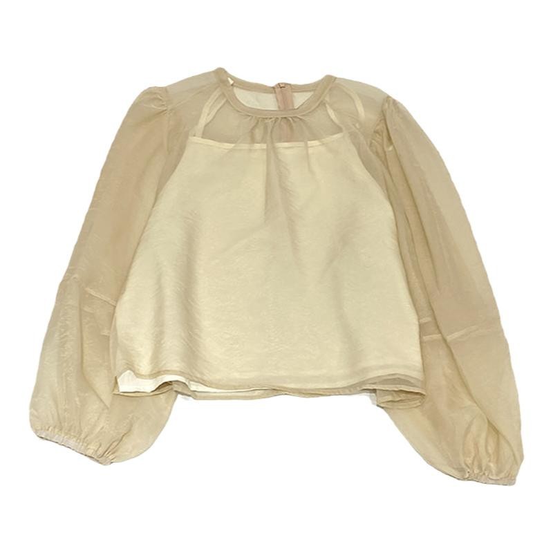 2024 Summer New French Micro-permeable Mesh Thin Puff Sleeve Lace Blouse Stacked Vest Two-piece Set