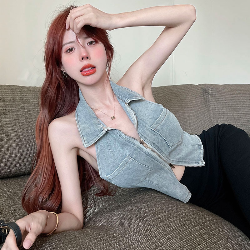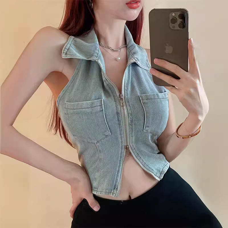 | nameOriginal | 2024 Summer New French Style Lap Leaky Back Neck Denim Small Vest Sleeveless Tight Waist Top Women's Clothing |