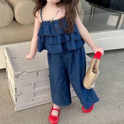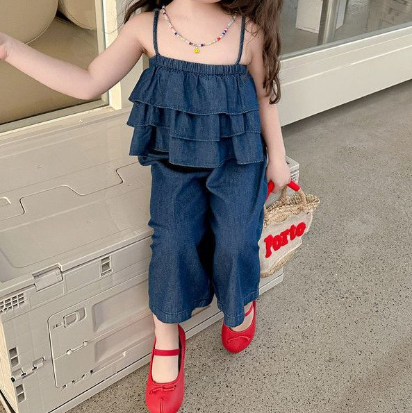 | nameOriginal | 2024 Summer New Girl suit Little Girl Sling Denim Wide Leg Pants Baby Short Sleeve Top Two-Piece Set |