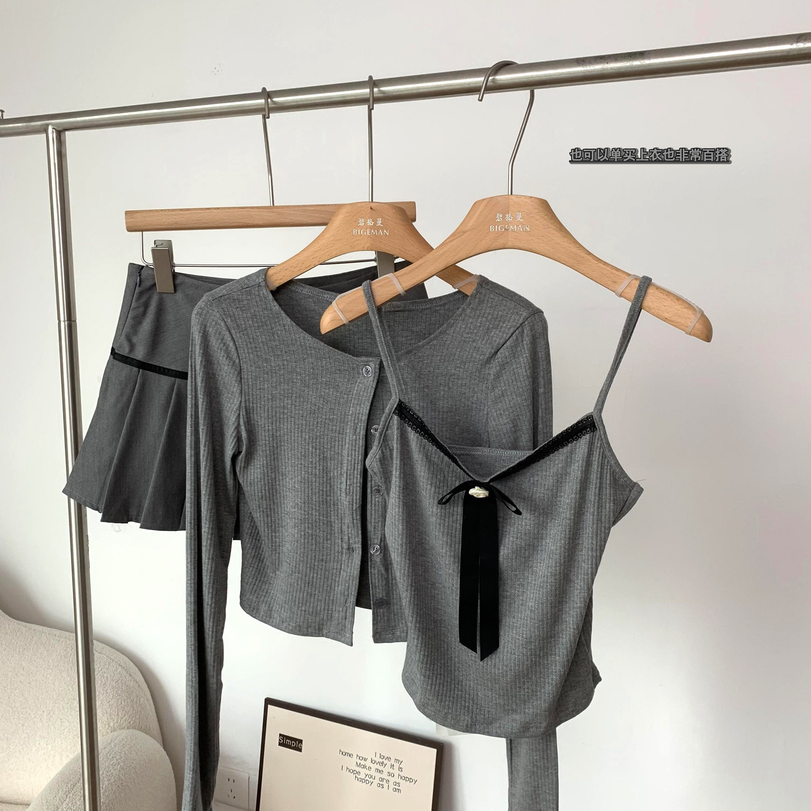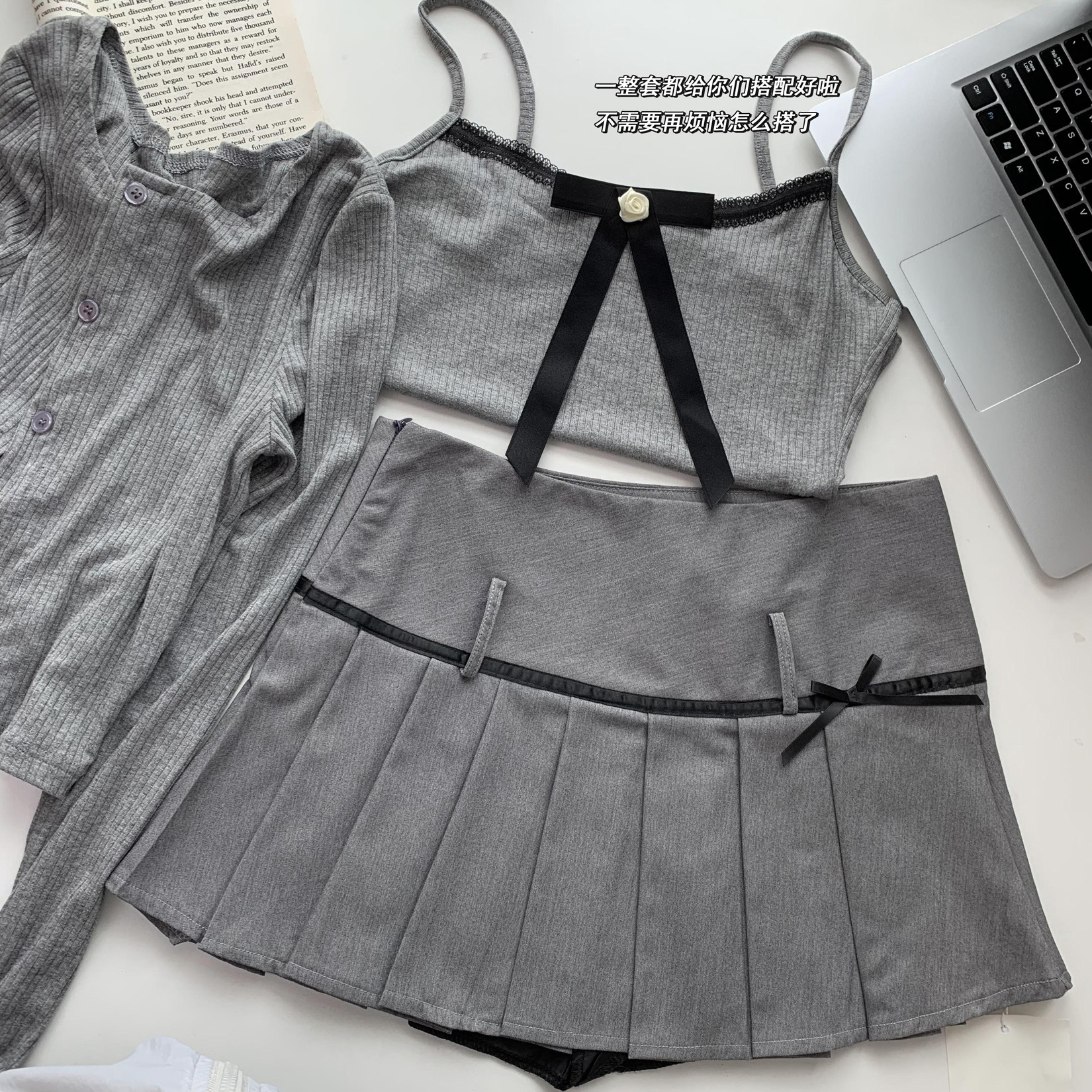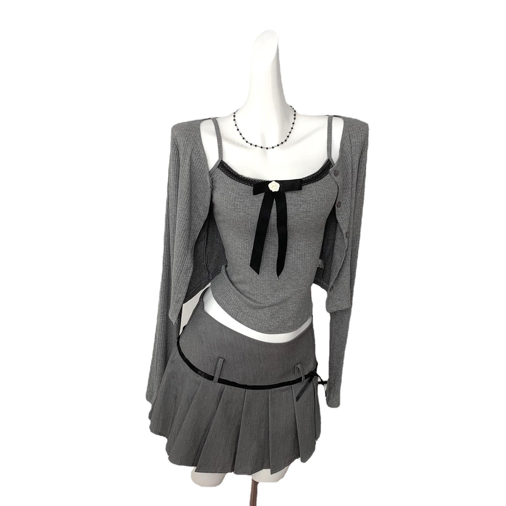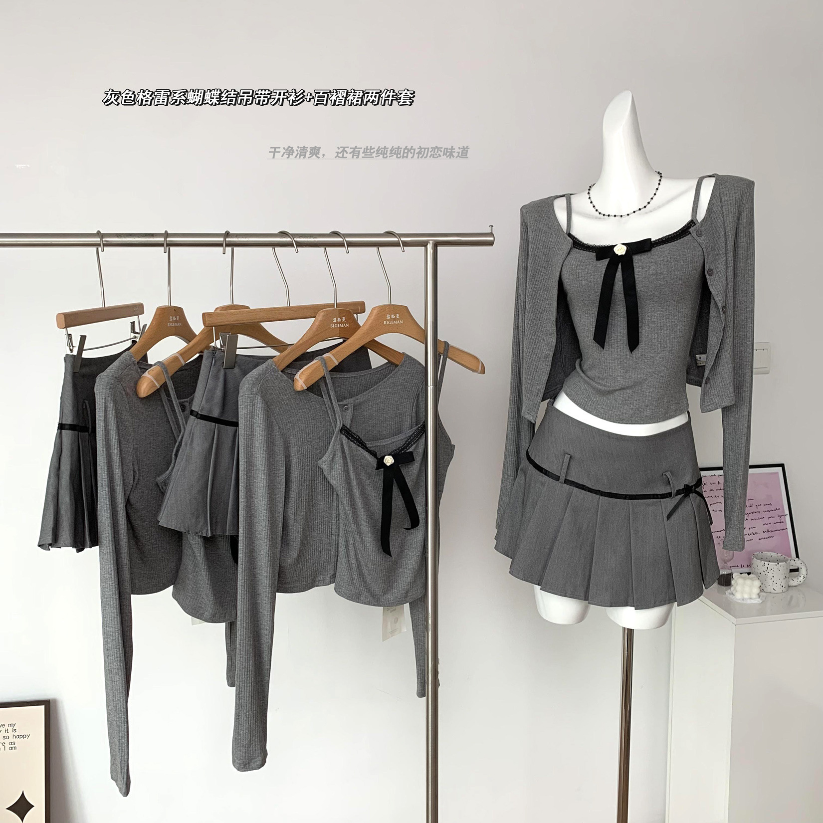 | nameOriginal | 2024 Summer New Gray Bow Strap Cardigan Pleated Skirt Two-piece Set |