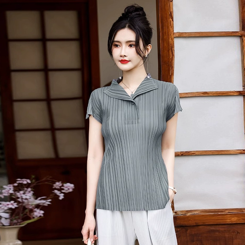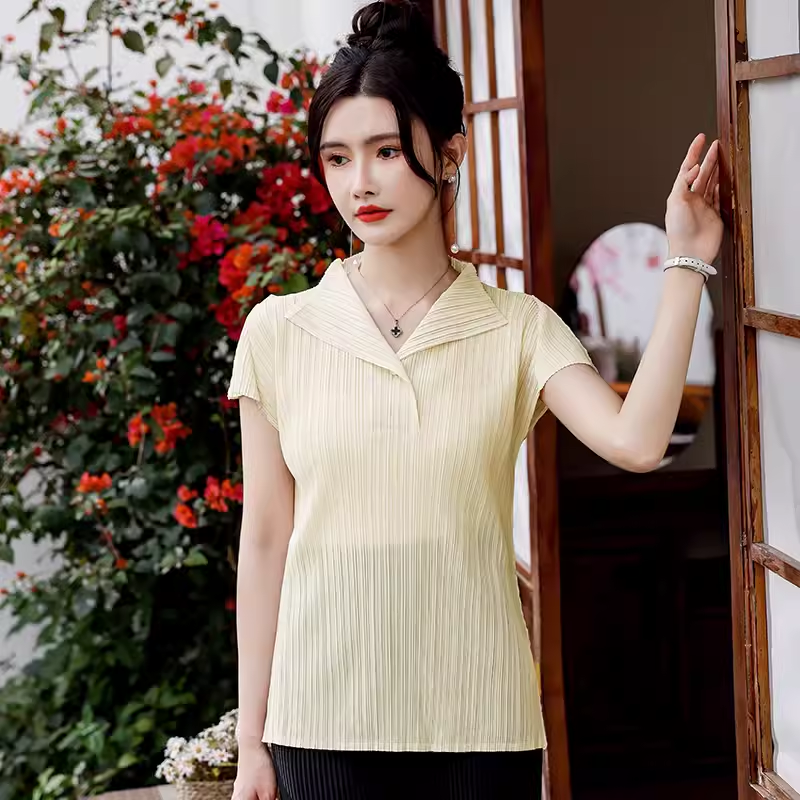 | nameOriginal | 2024 summer new high-end pleated temperament versatile short-sleeved half-open collar top pleated casual simple T-shirt for women |