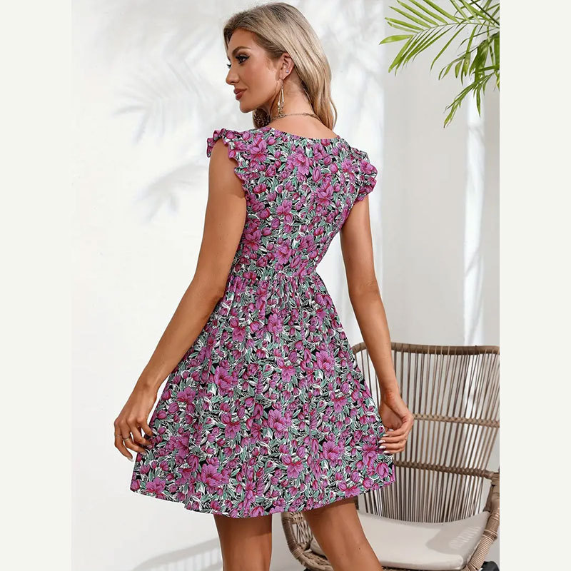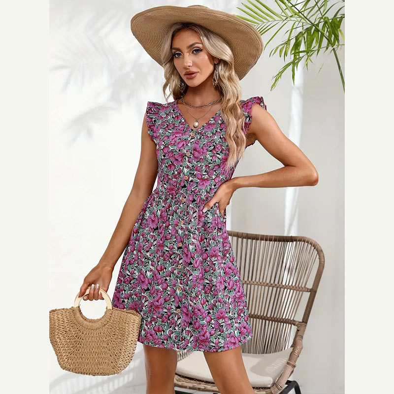 | nameOriginal | 2024 Summer new holiday style woven flying sleeve floral tight waist short dress button sleeveless V-neck skirt |