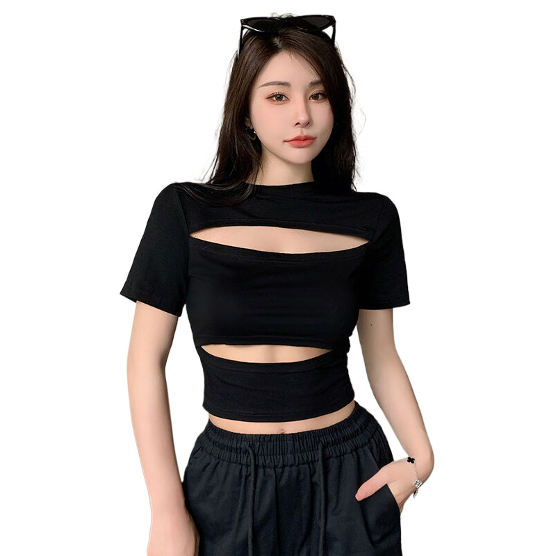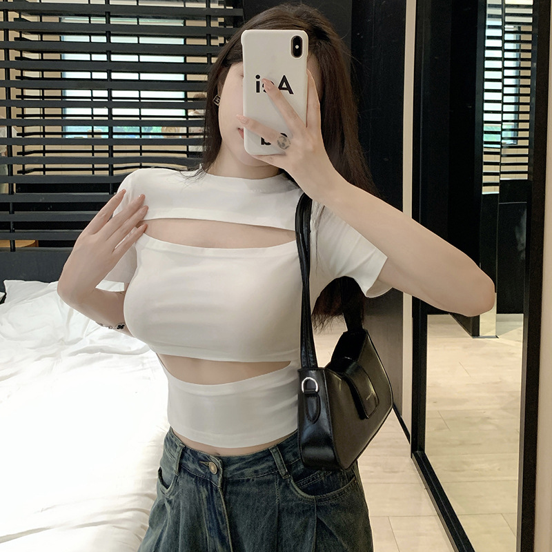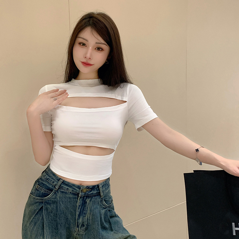 2024 Summer New Hot Girls Hollow-out Design Sense Niche American Hot Girls Short Slim-fit Slimming Short-sleeved T-shirt Trendy