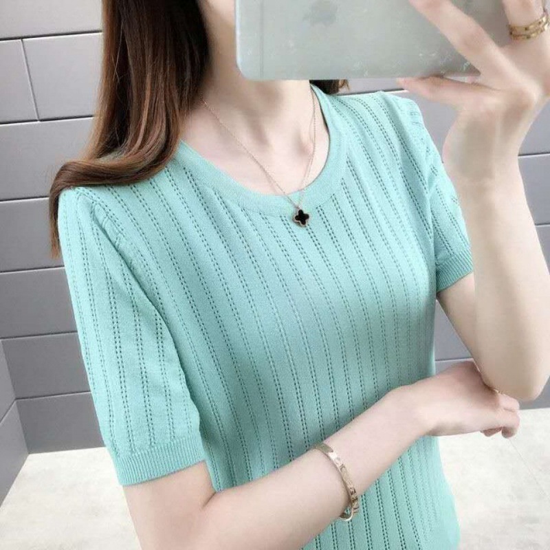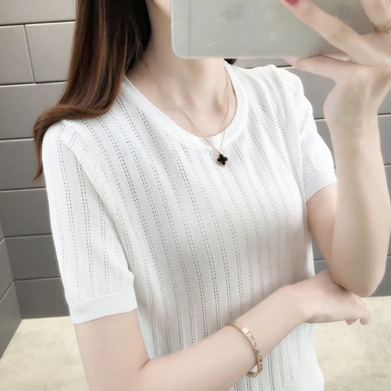 2024 Summer New Ice Cool Silk Short-sleeved T-shirt Women’s Crewneck Pullover Hollow Knitted Fashionable Thin Top Trend