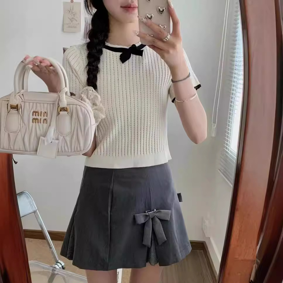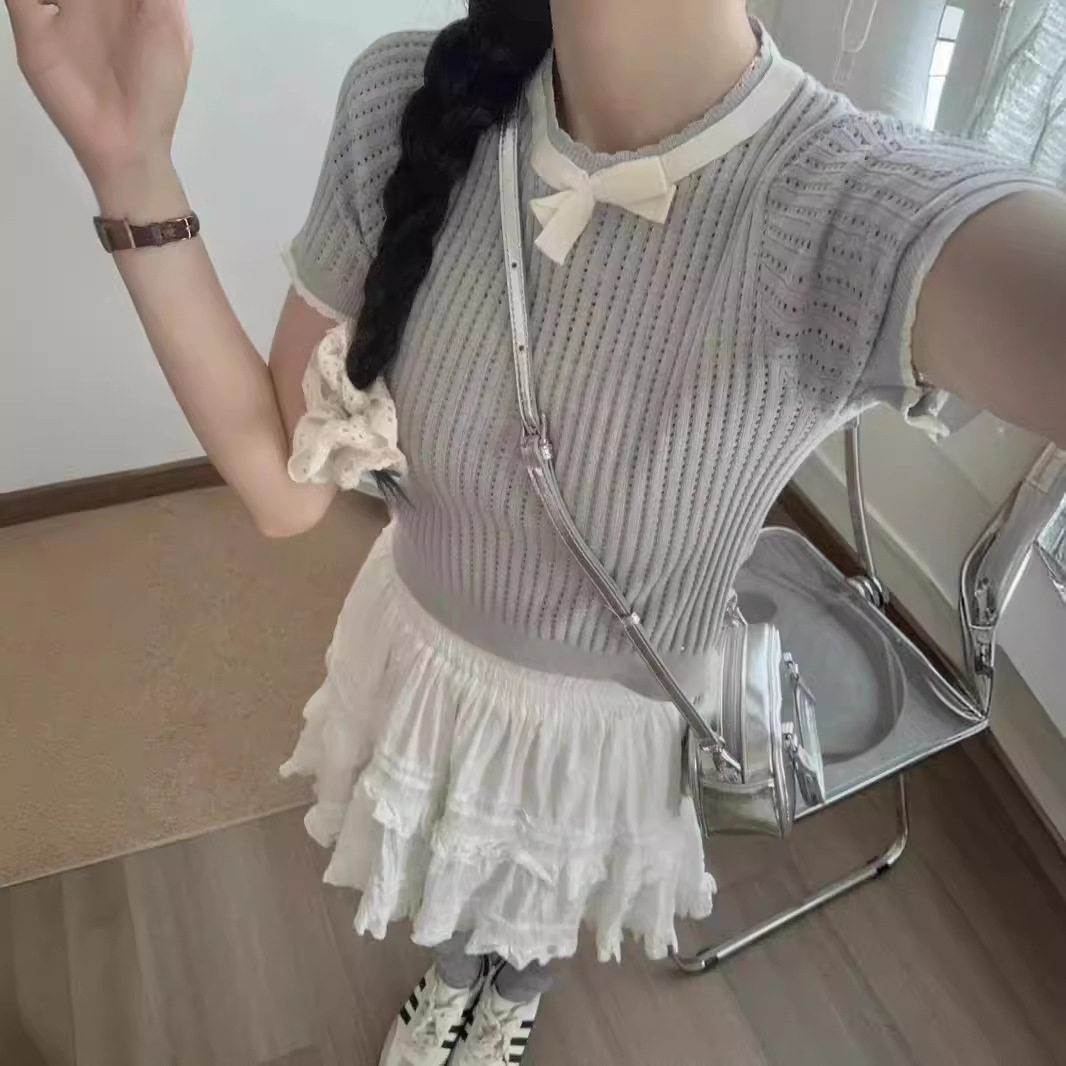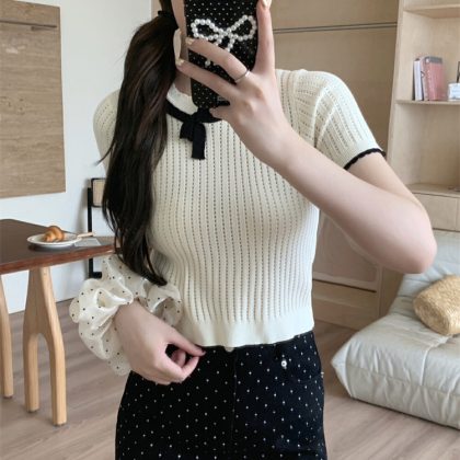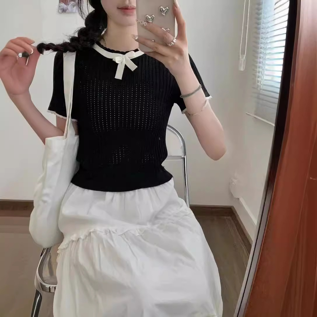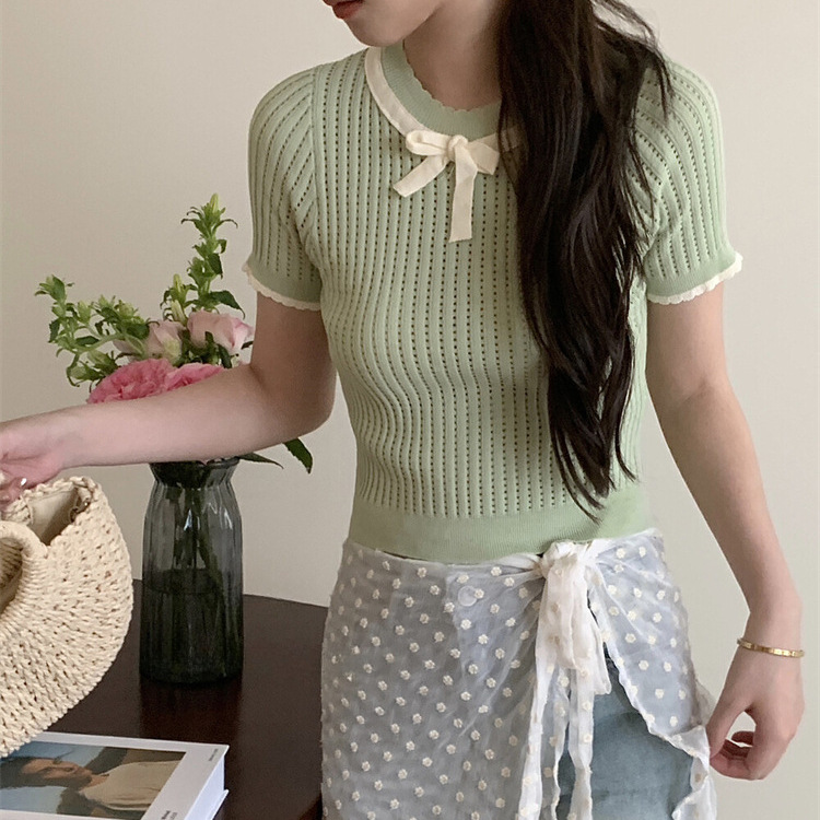 | nameOriginal | 2024 Summer New Korean Ladies Elegant Knitted Small Shirt Bow Contrast Color Hollow All-match Short-sleeve Top |