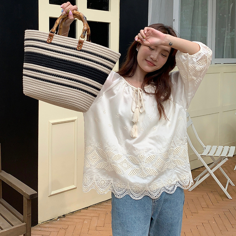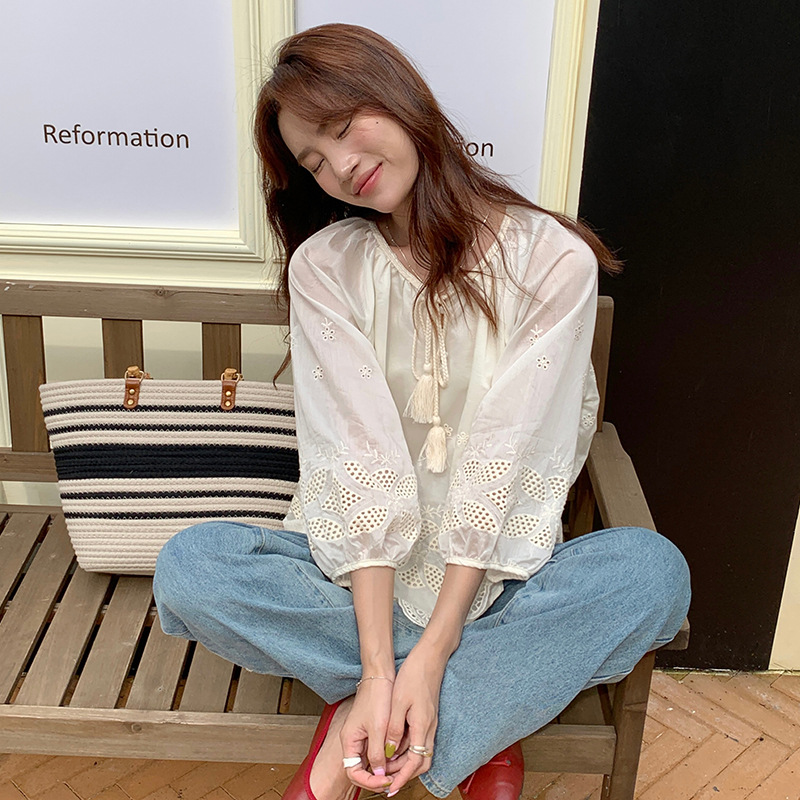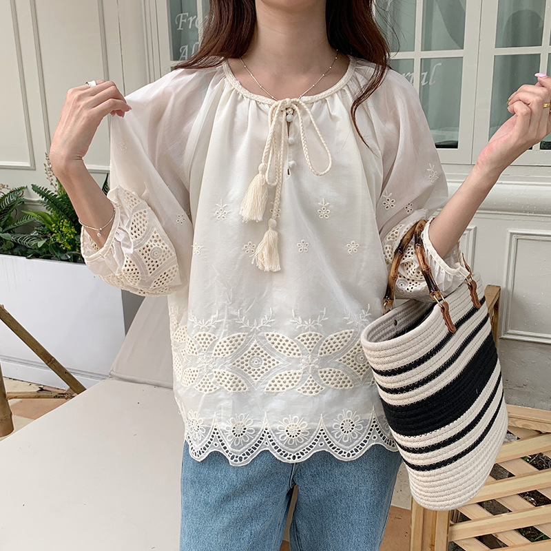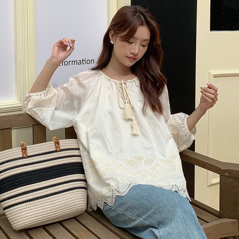 | nameOriginal | 2024 Summer New Korean Style All-match Round Neck Lace-up Lantern Sleeve Seven-point Sleeve Doll Shirt Women's Shirt |