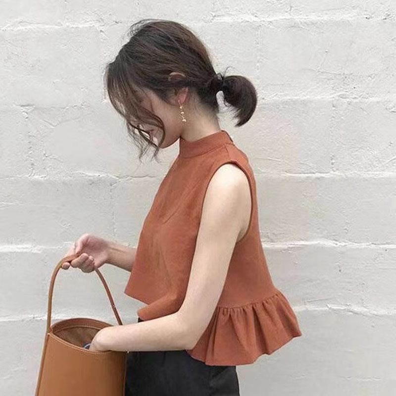 2024 Summer new Korean style simple solid color all-match sleeveless vest student outer wear short ruffled top for women