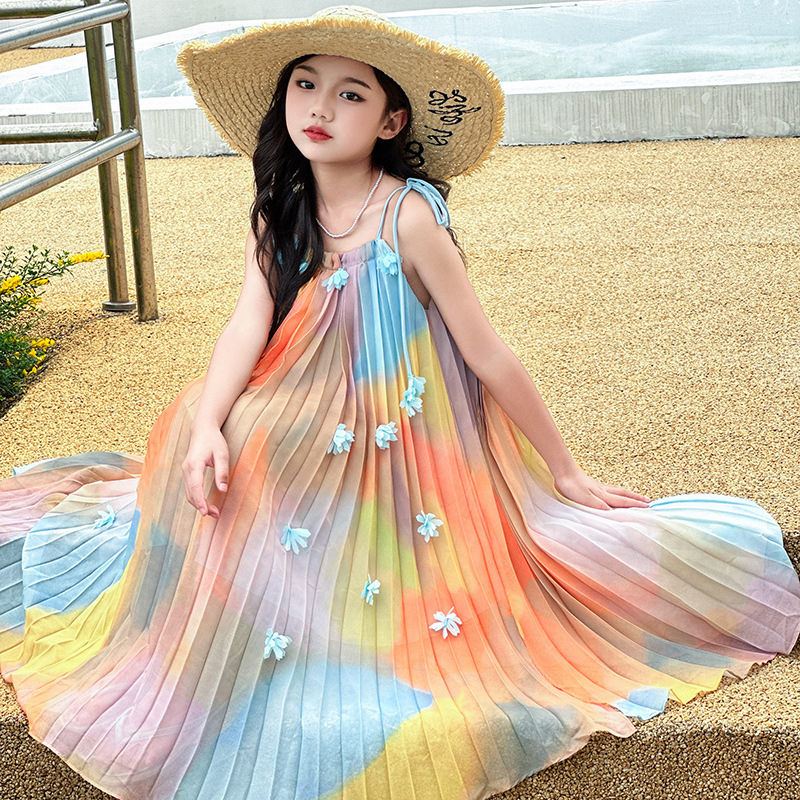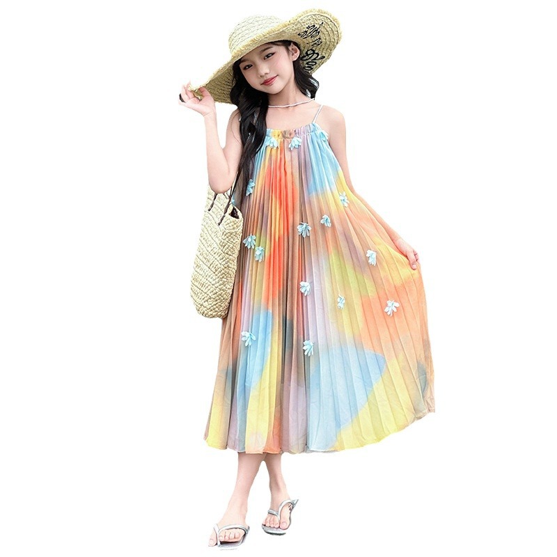 2024 Summer New Korean Style Tie-Dye Printed Rainbow Color Beach Dress Women's Large Children's Sling A- line Princess Dress