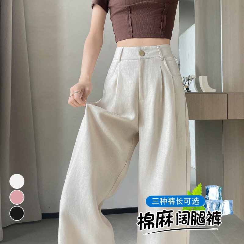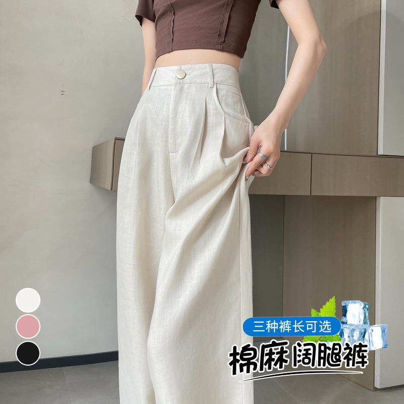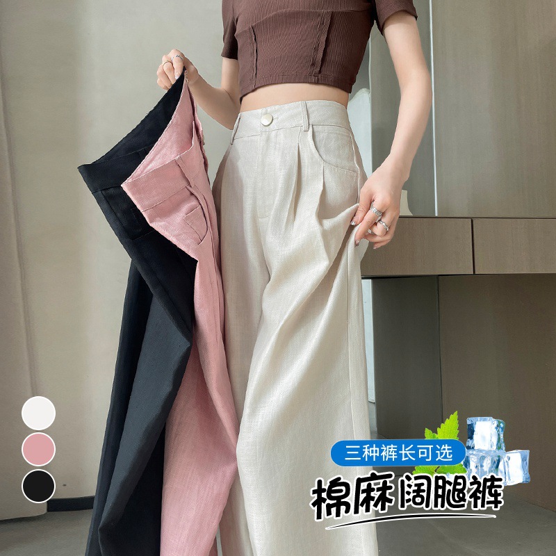 2024 summer new linen wide leg pants ice silk high waist straight tube cotton suit pants casual pants…