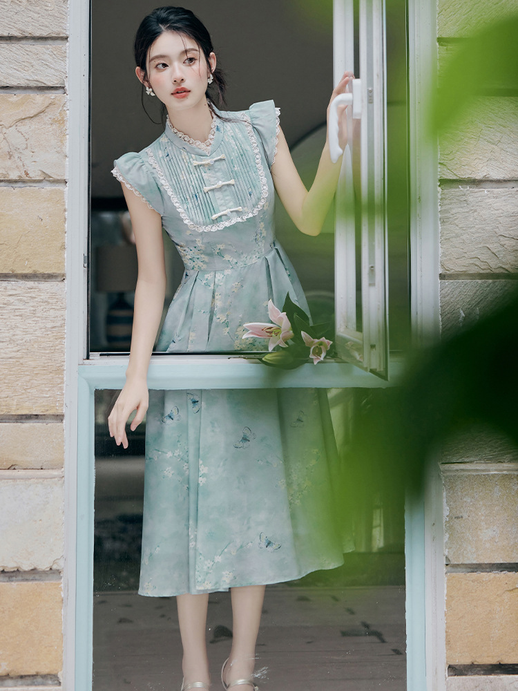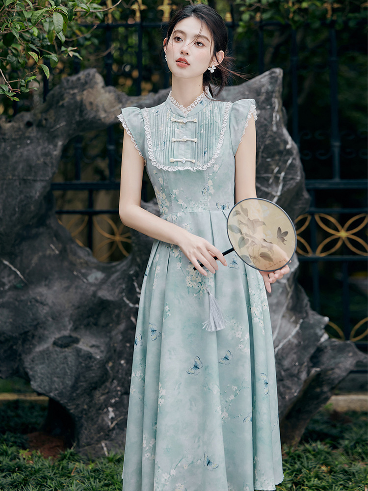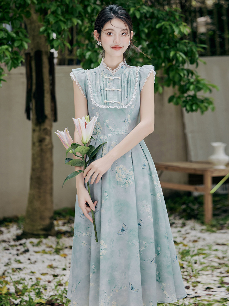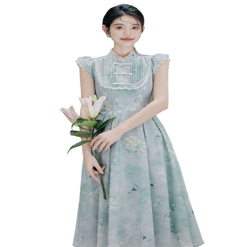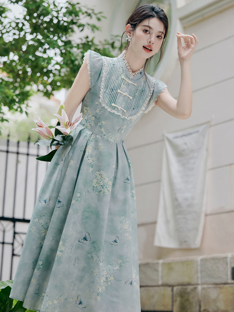 | nameOriginal | 2024 summer new new Chinese-style buckle cheongsam collar small sleeve waist vintage printing summer dress 40 |