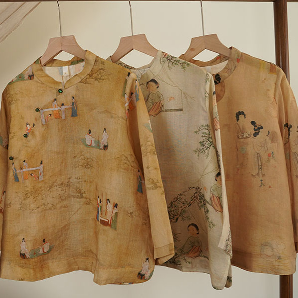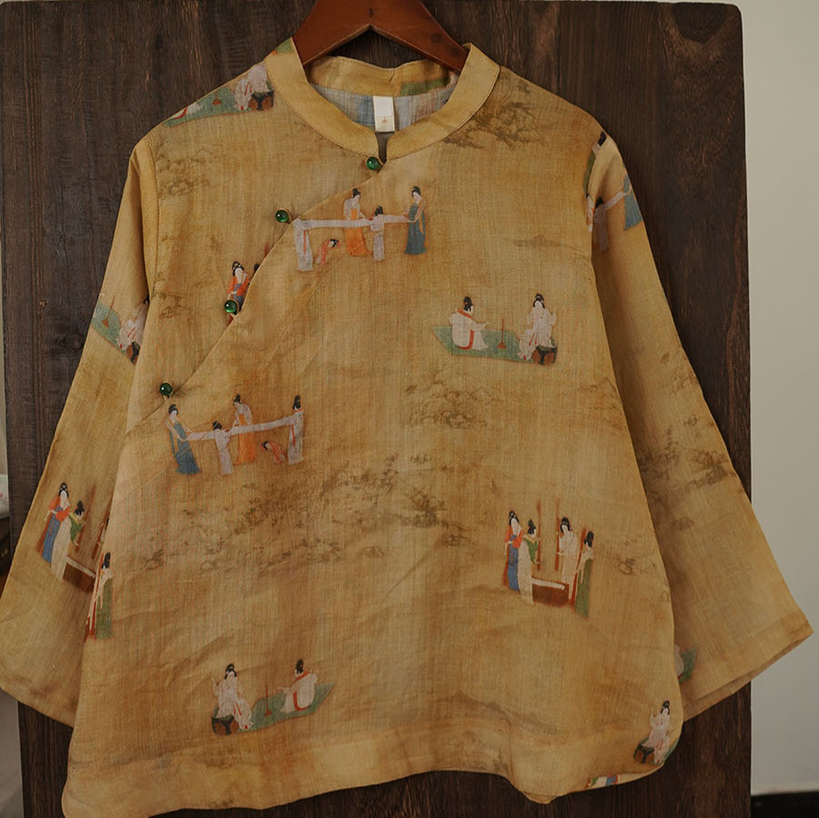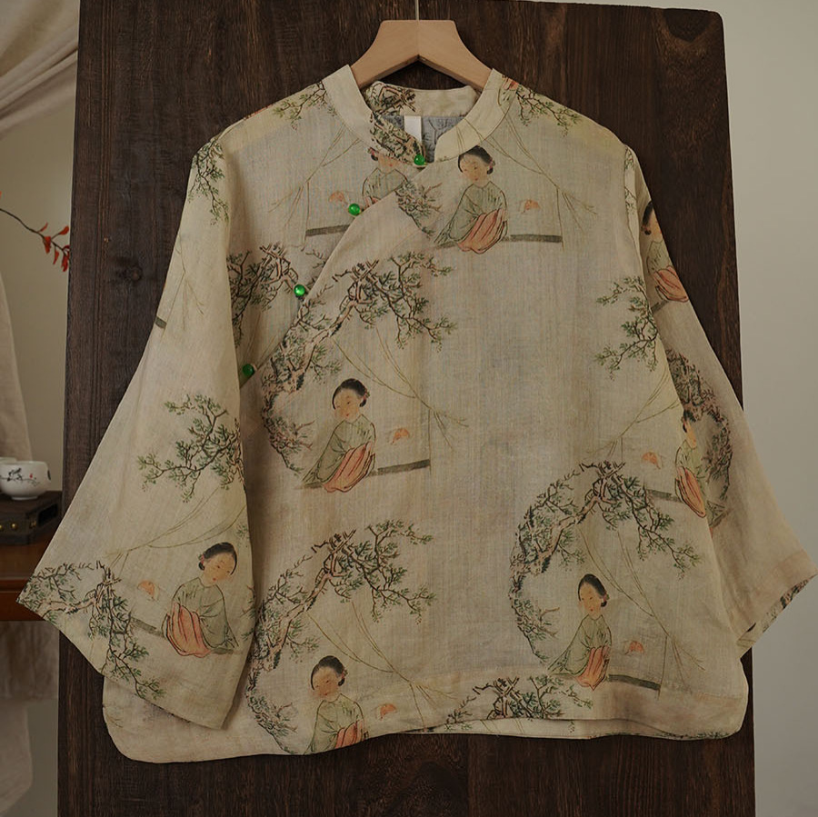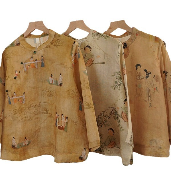 2024 Summer New New Chinese Style Ramie Digital Printing Single Layer Wide Sleeve Zen Tea Suit 012