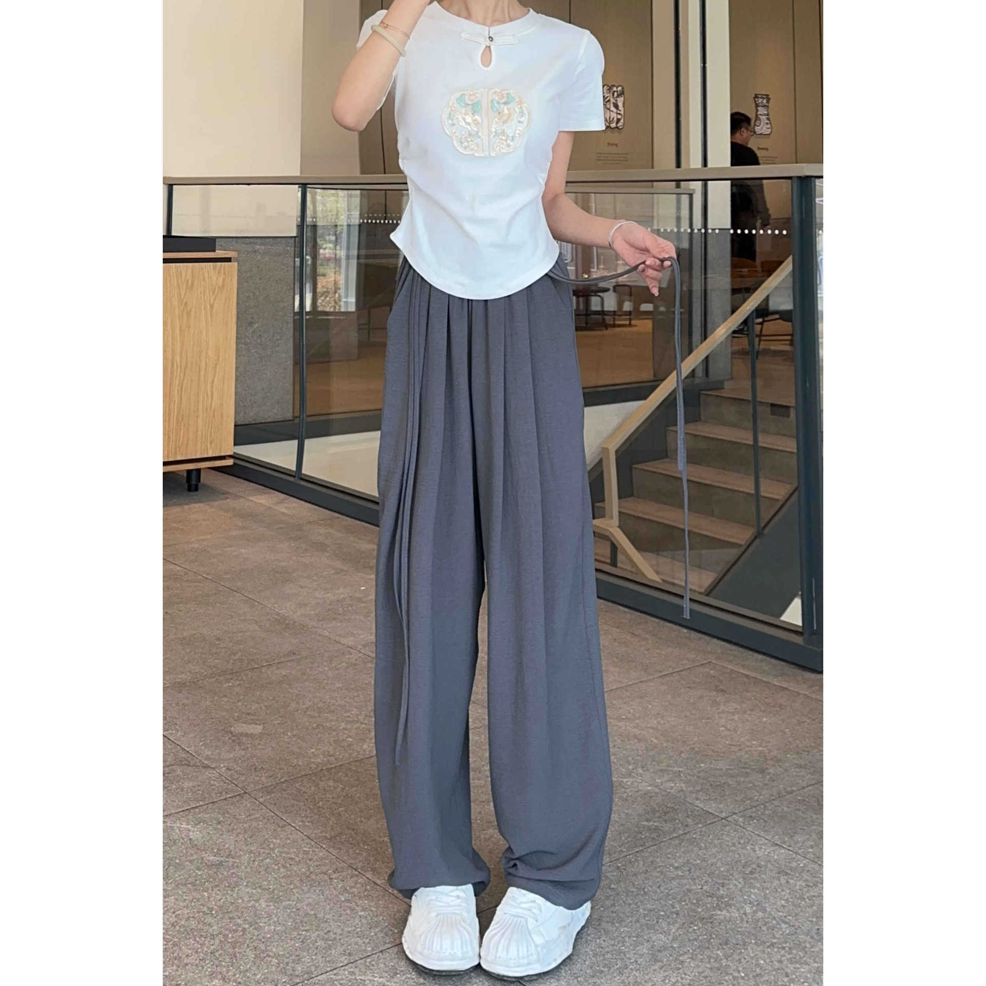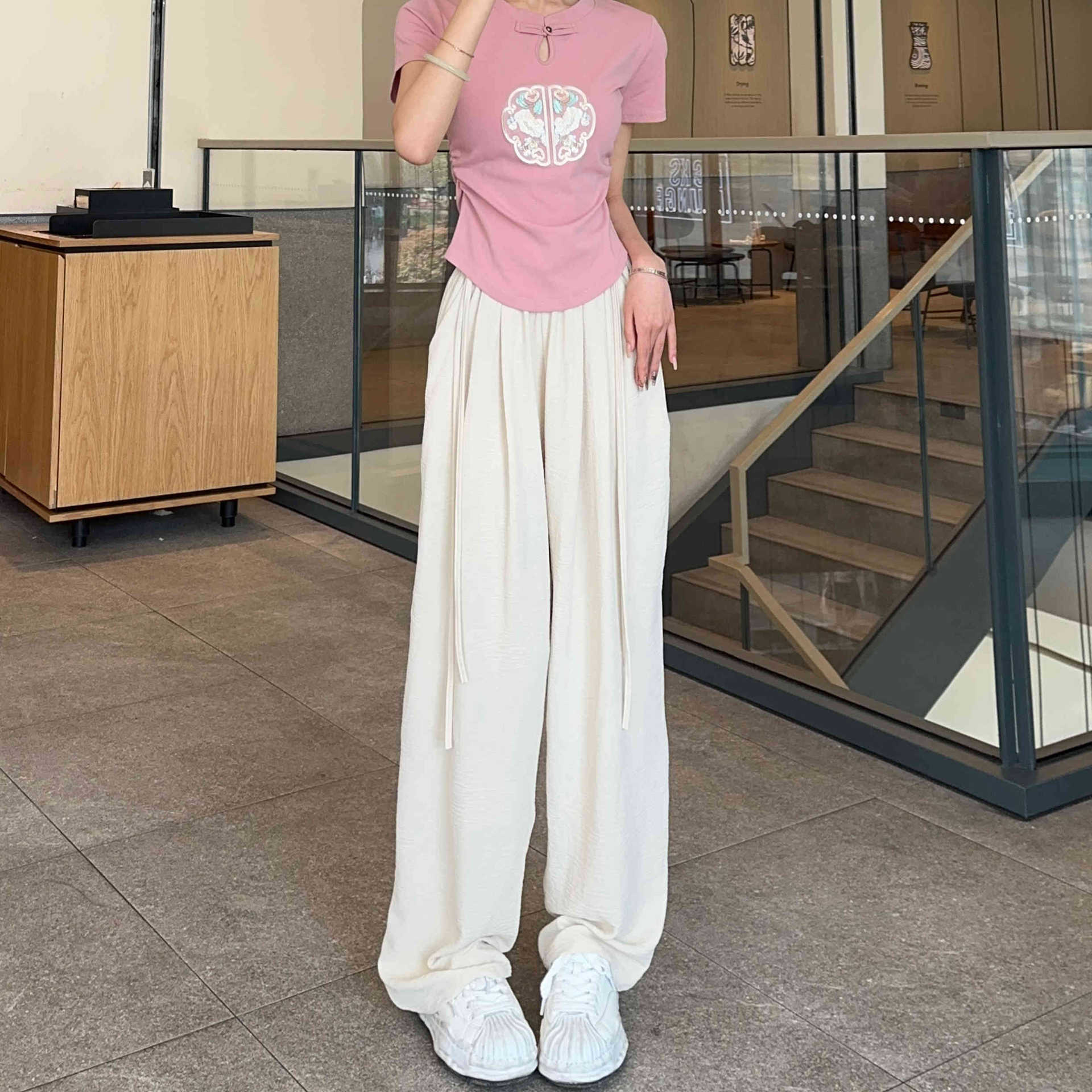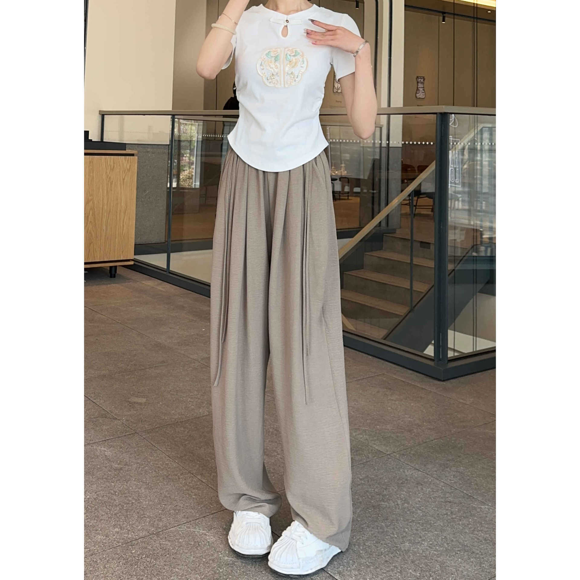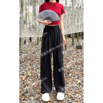 2024 Summer New New Chinese Style Wide Leg Pants with Strap for Women Slim Look Lightweight Nose Loose National Style Casual Flooring Pants