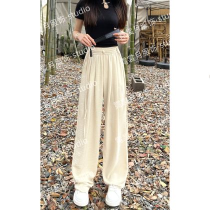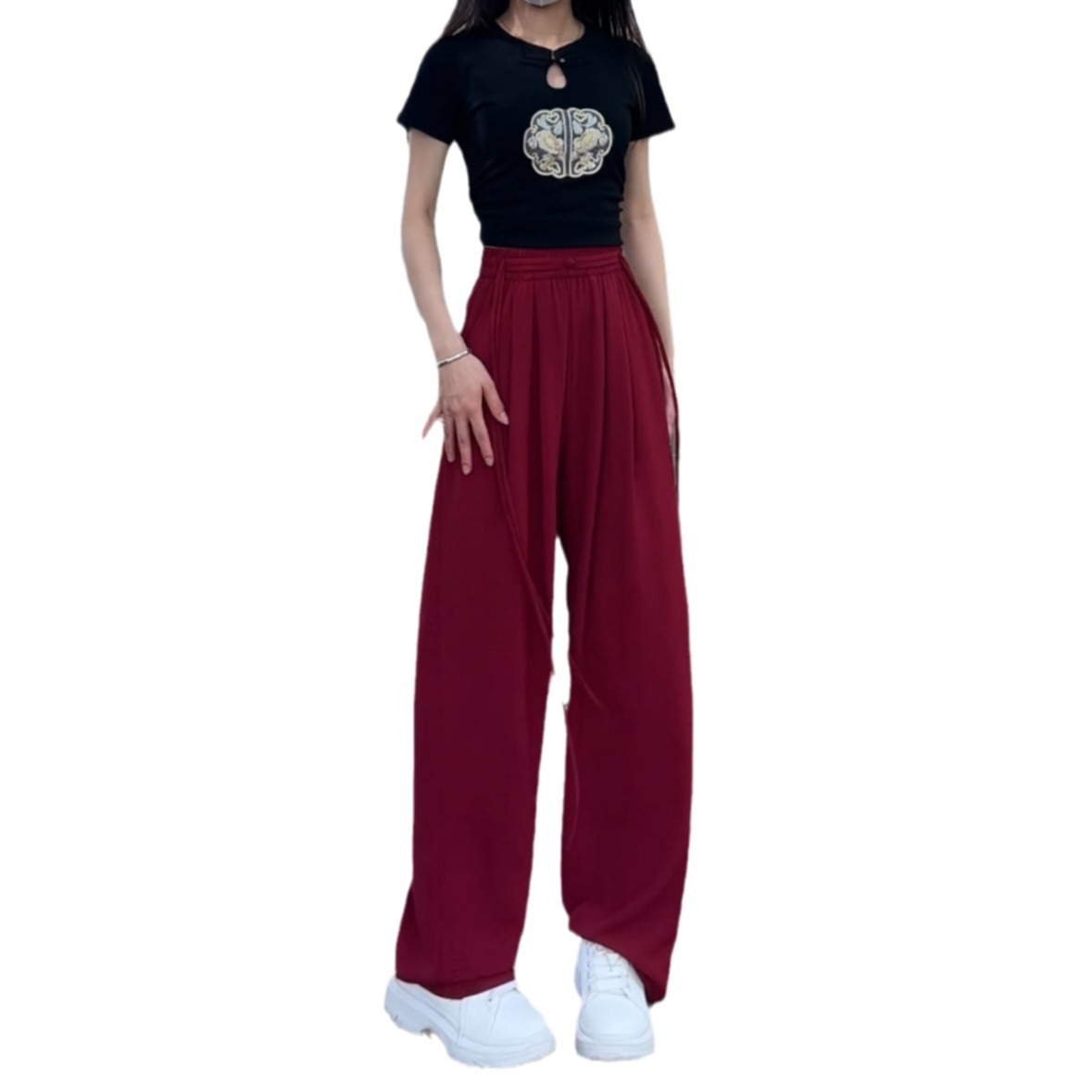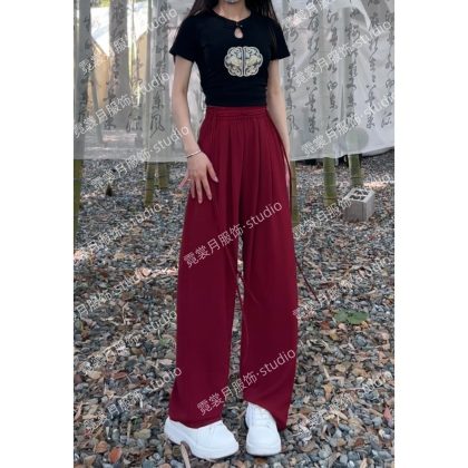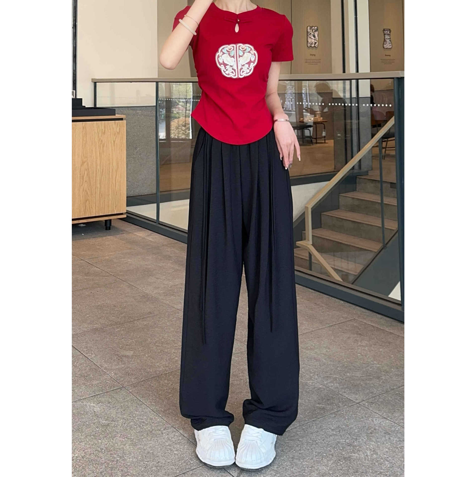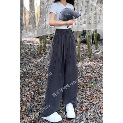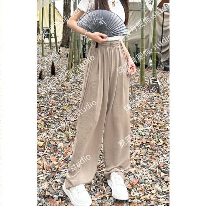 2024 Summer New New Chinese Style Wide Leg Pants with Strap for Women Slim Look Lightweight Nose Loose National Style Casual Flooring Pants