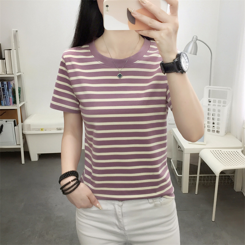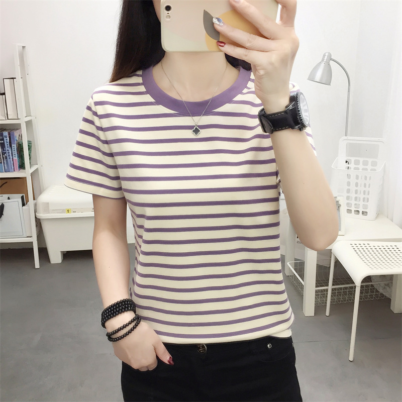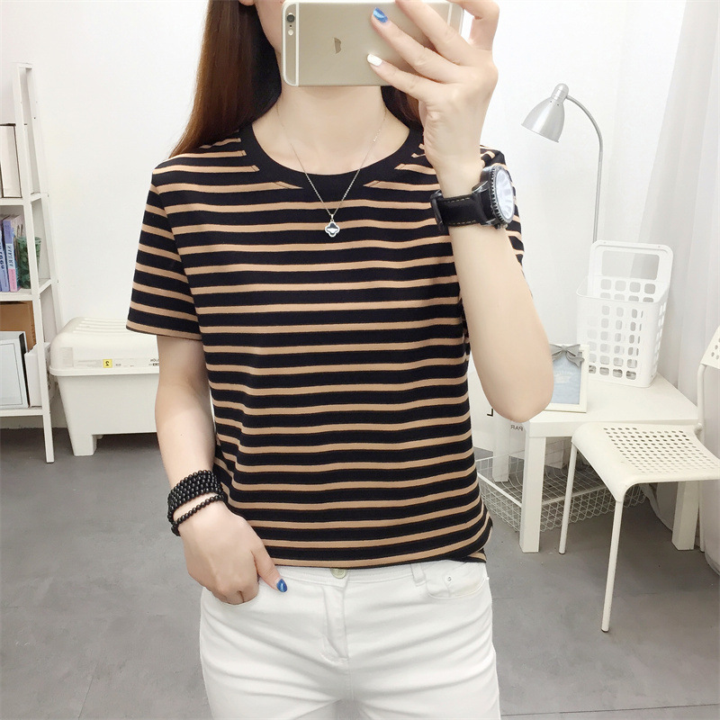 2024 Summer New Round Neck Striped Short Sleeve Women's Casual Loose All-match Classic Top Trendy