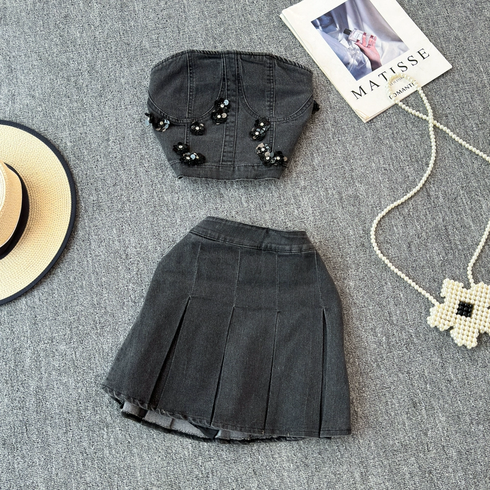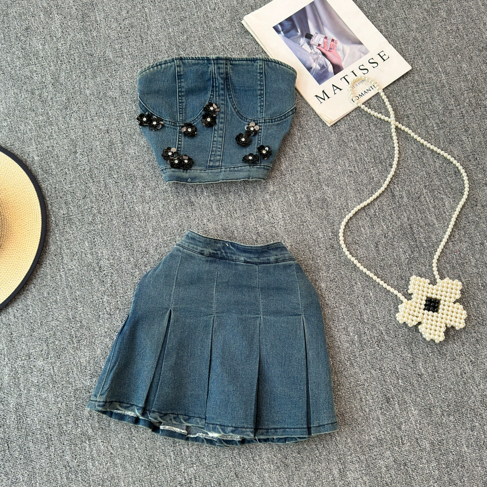 | nameOriginal | 2024 Summer New Sexy Three-dimensional Flower Denim Short Tube Top French High Waist Pleated Skirt |