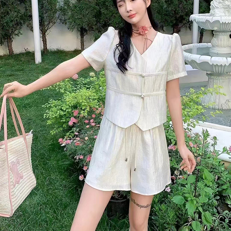 | nameOriginal | 2024 Summer New Shorts suit Women's Fashion New Chinese V-neck Short Sleeve Top Wide Leg Shorts Two-piece suit |