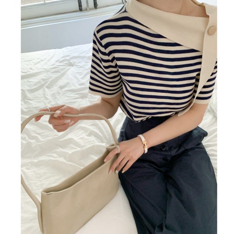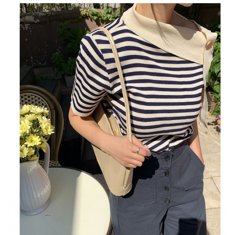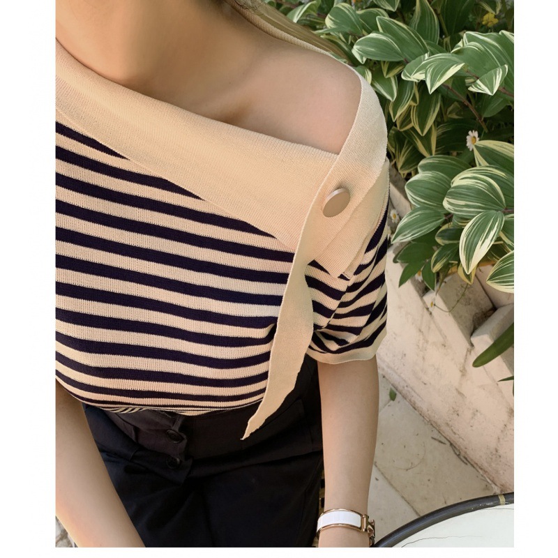 | nameOriginal | 2024 Summer New South Korea Chic Niche Design Striped Shoulder Buckle Thin Ice Silk Knit Top |