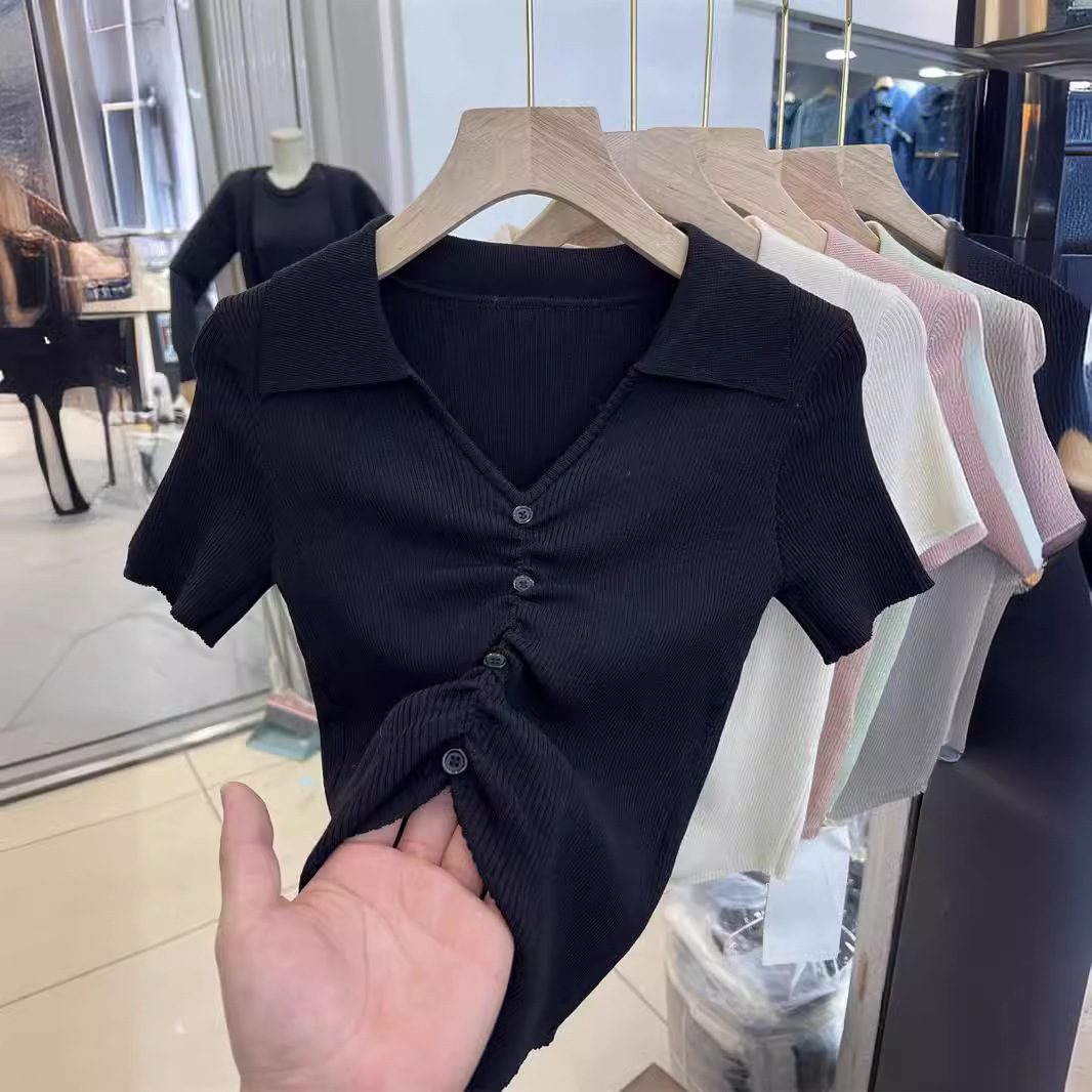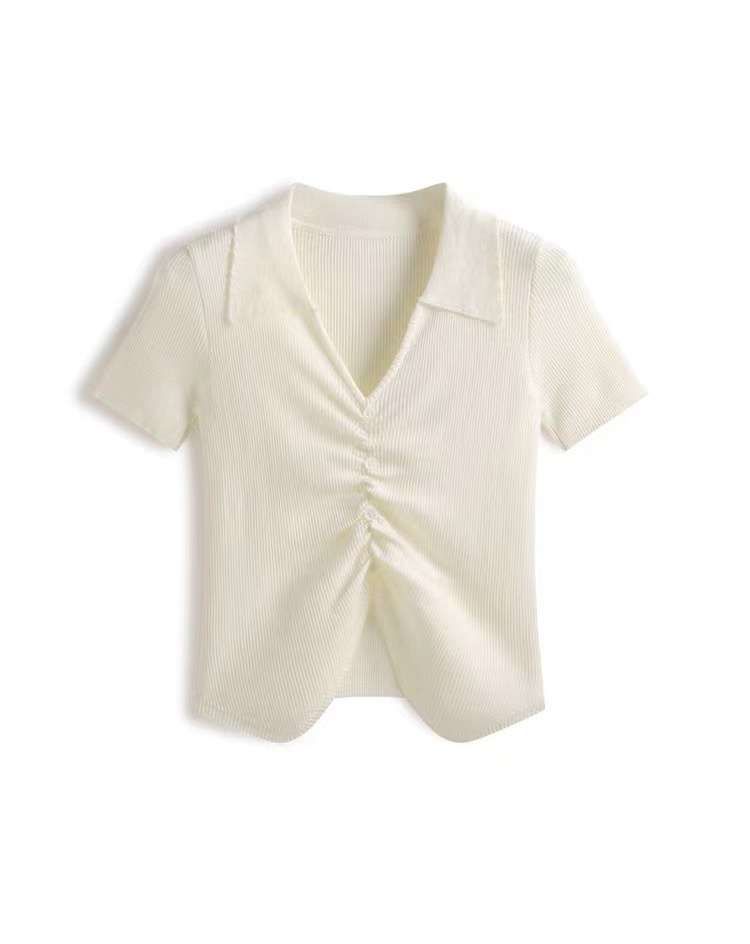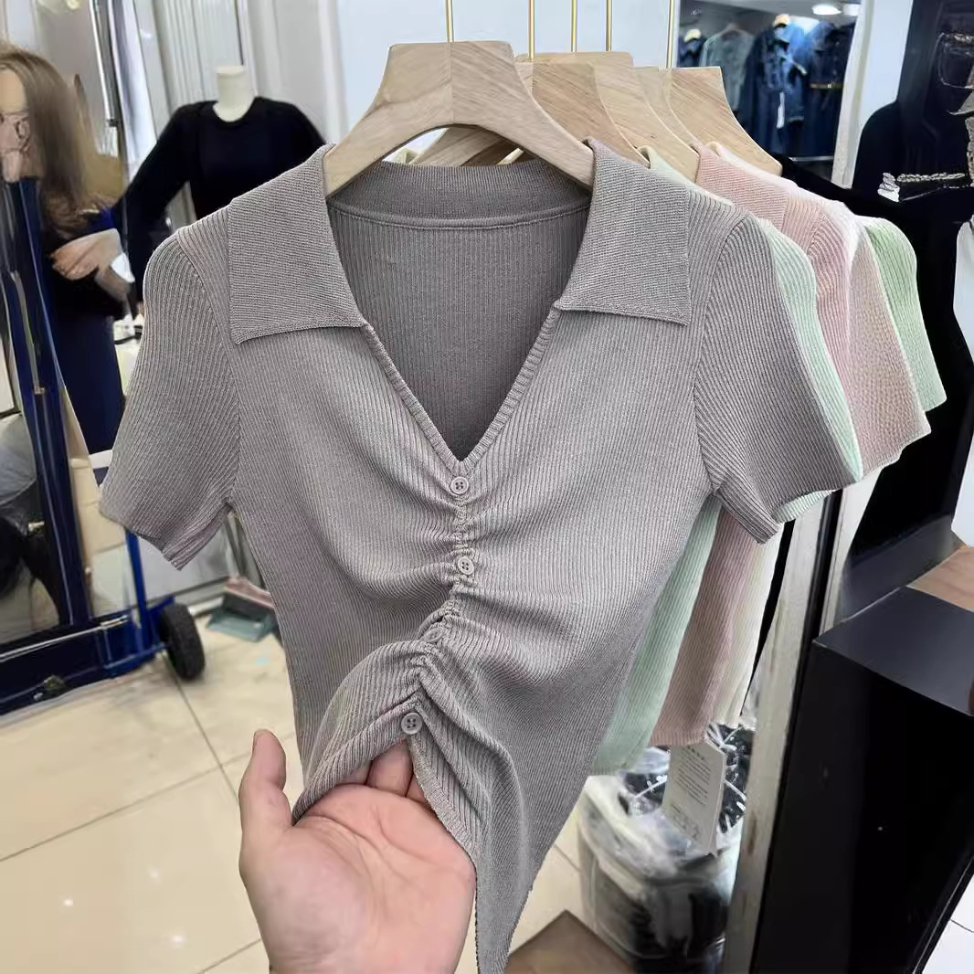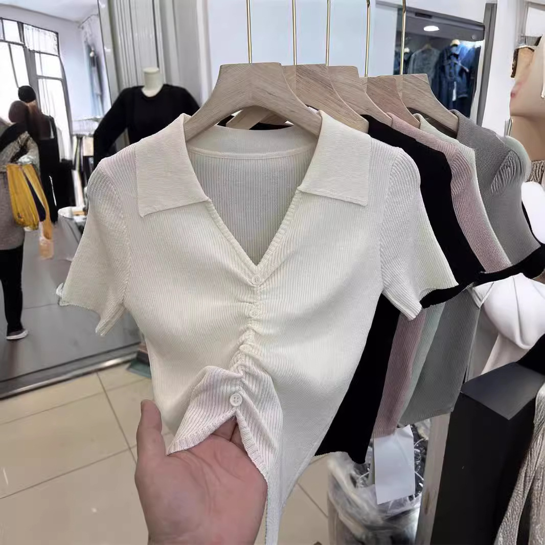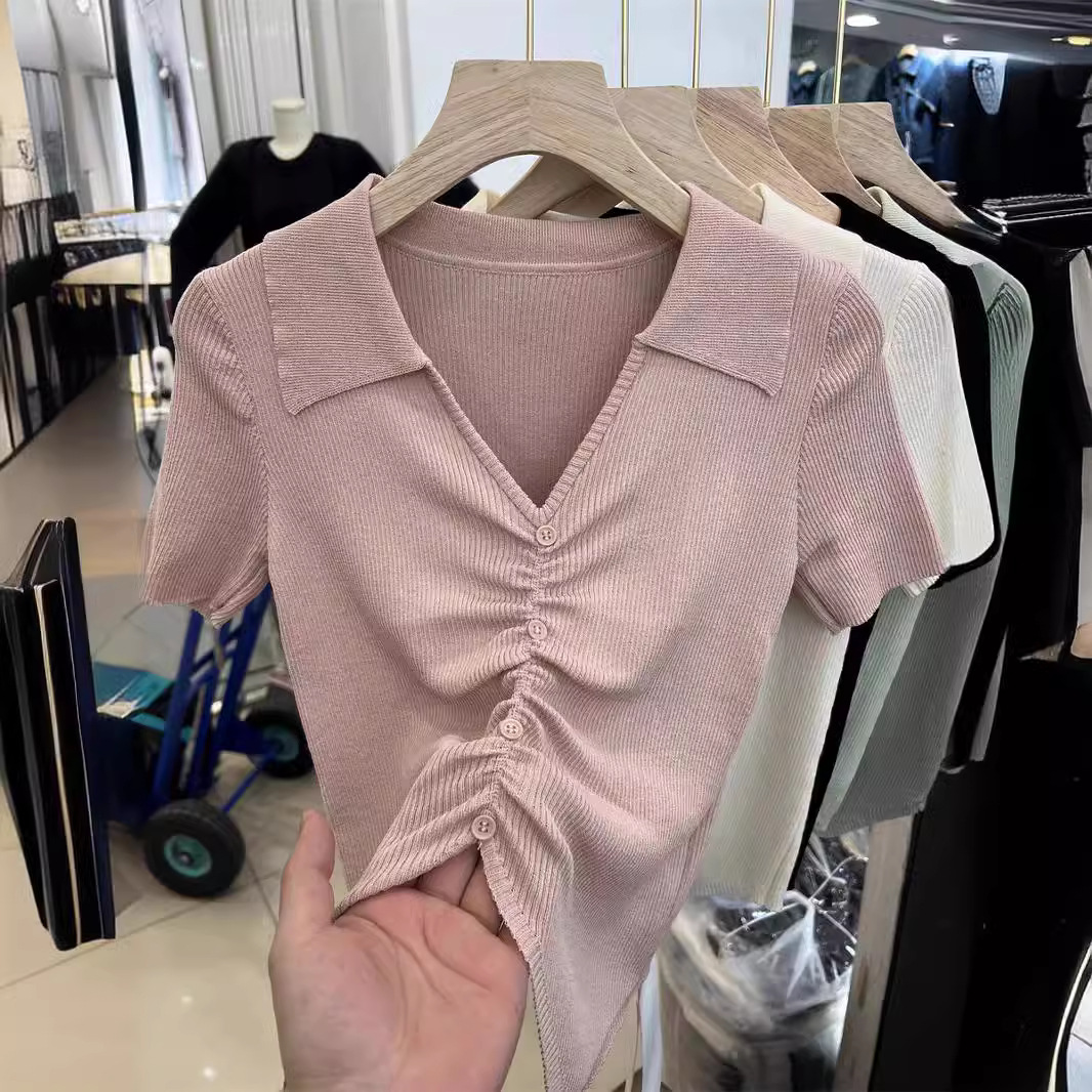 | nameOriginal | 2024 Summer New Spice Girl Design Sense Solid Color Lapel Pleated Slim-Fit Slimming Short-Sleeved Knitted T-Shirt Top |