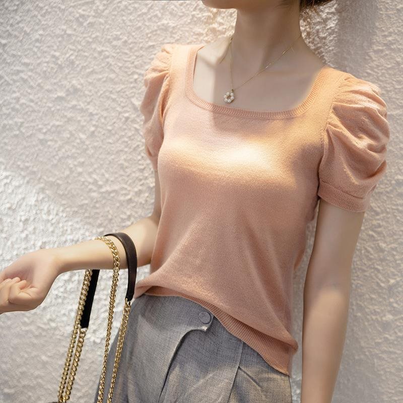 | nameOriginal | 2024 Summer New Square Collar Bubble Short-sleeved Slim-fit Slimming Ice Silk Knitted Sweater Ultra-thin Micro-transparent Short Top for Women |