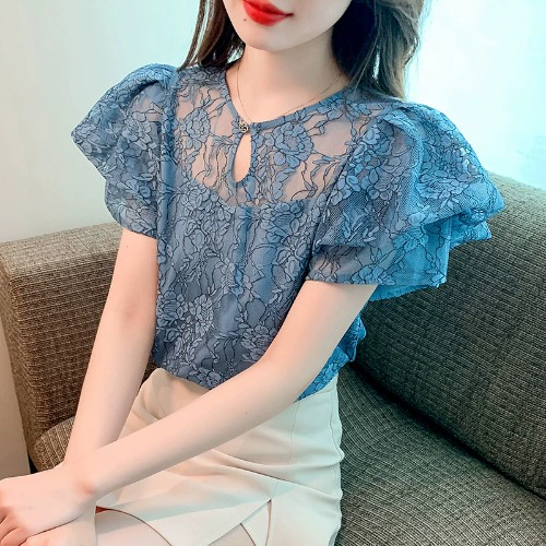 2024 summer new style French puff sleeve lace embroidery crochet top with unique design and flying sleeves blouse