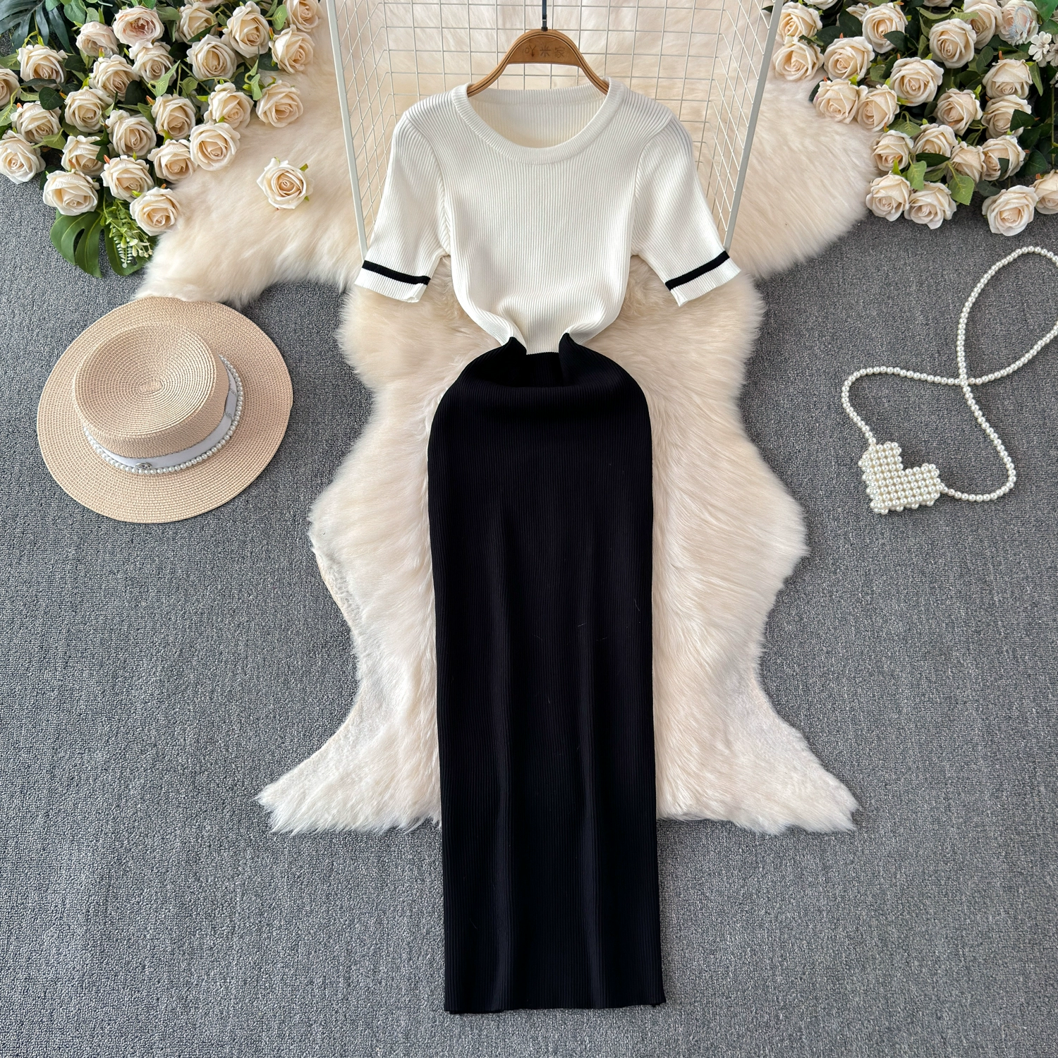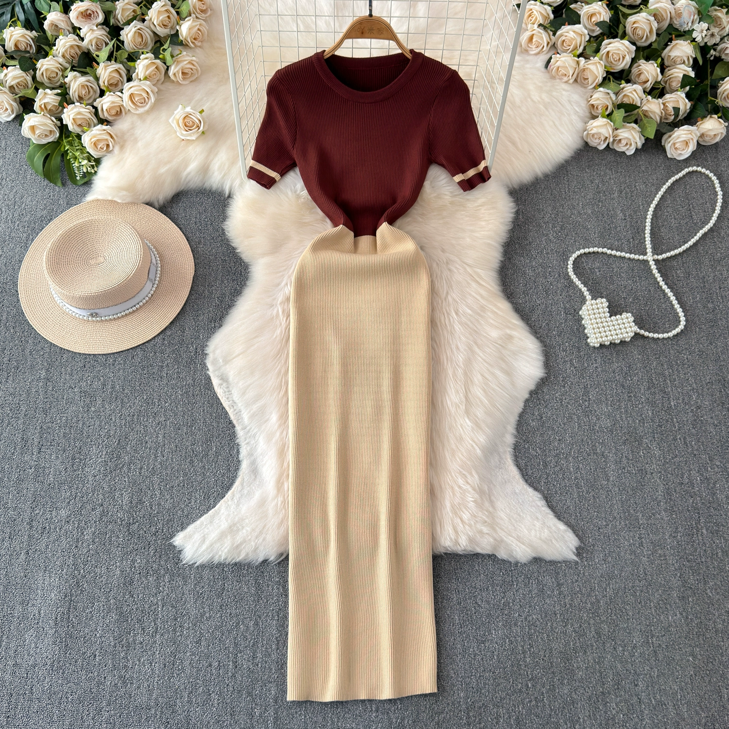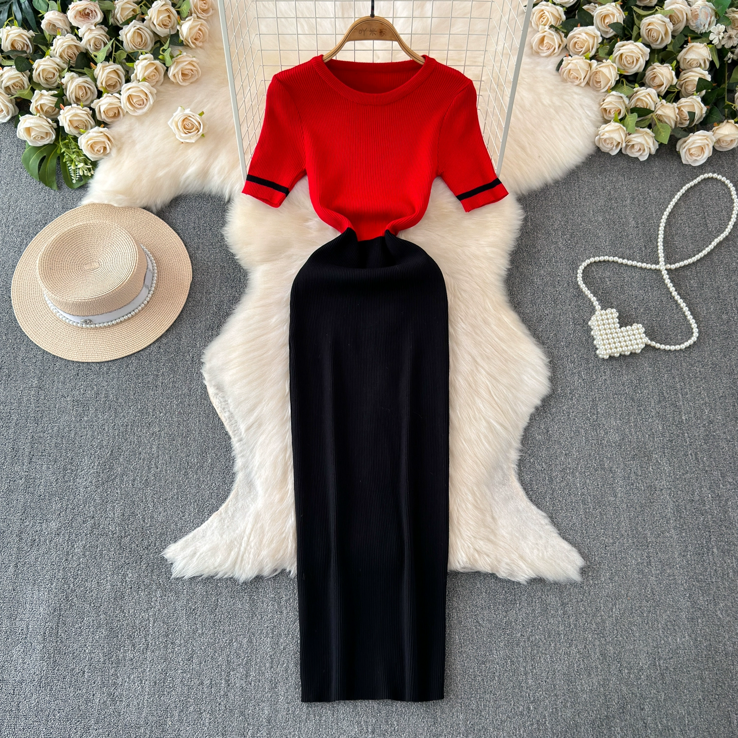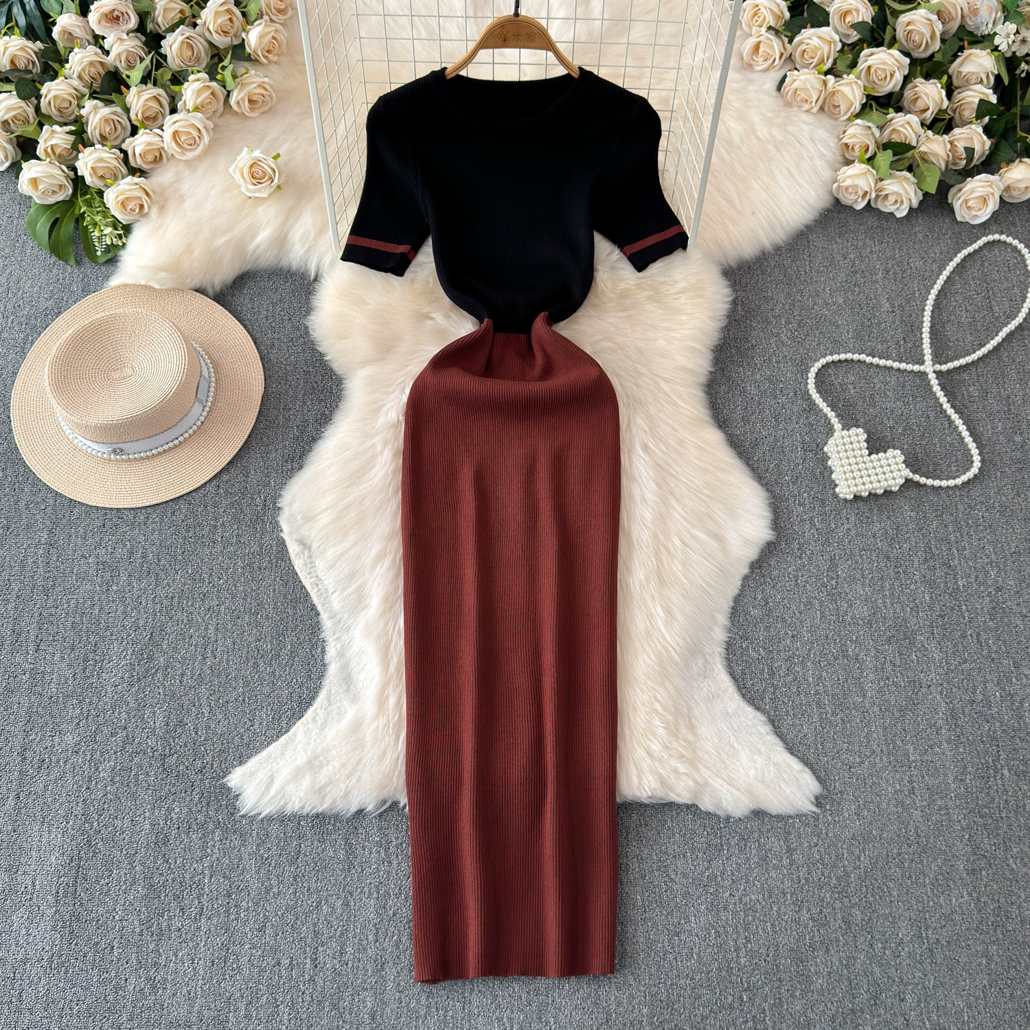 | nameOriginal | 2024 summer new style round neck fashion casual knitted slim fit waist single piece splicing feminine dress |