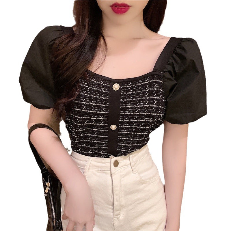 2024 Summer New Style Temperament Hong Kong Style Short-sleeved Stitching Puff Sleeve Ice Silk Women's Slim-fit Square Collar Knitted Top Ins