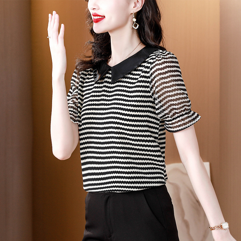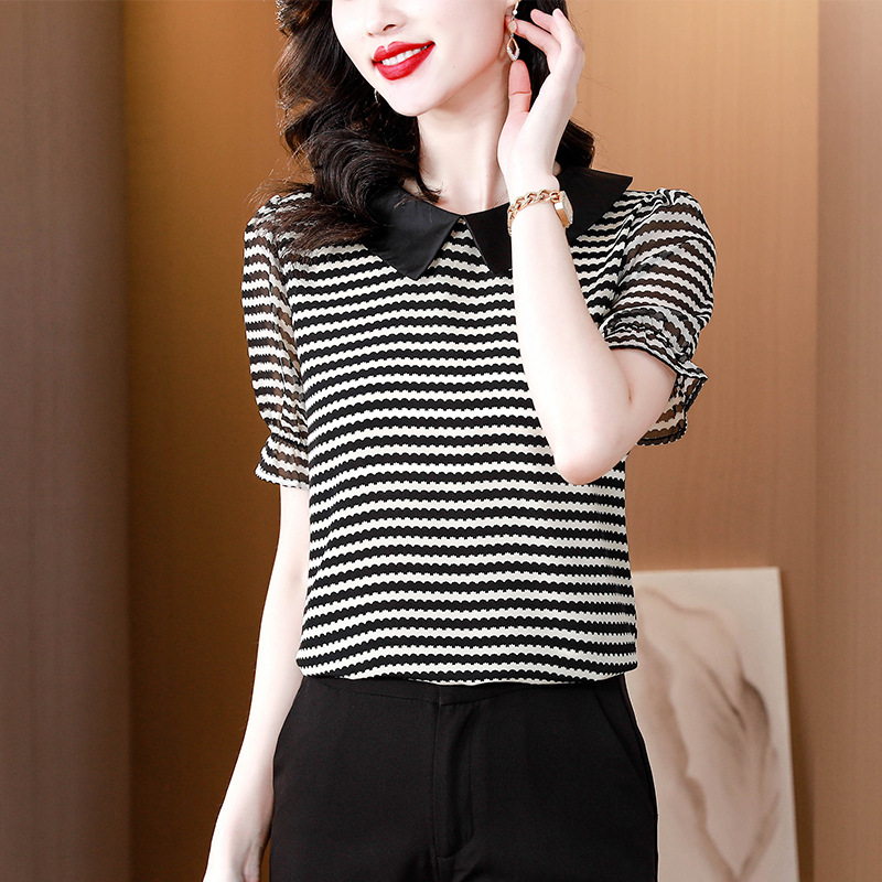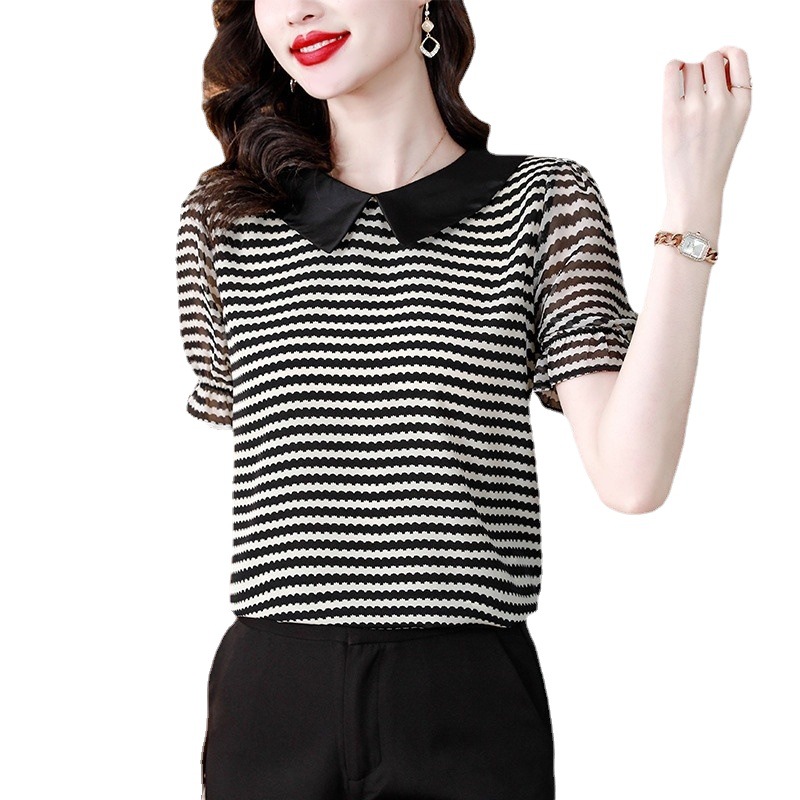 2024 Summer New Style Thin Elegant Doll Collar Top Women's Striped Design Sense Short-sleeved Slim-fit Fashionable Chiffon Shirt