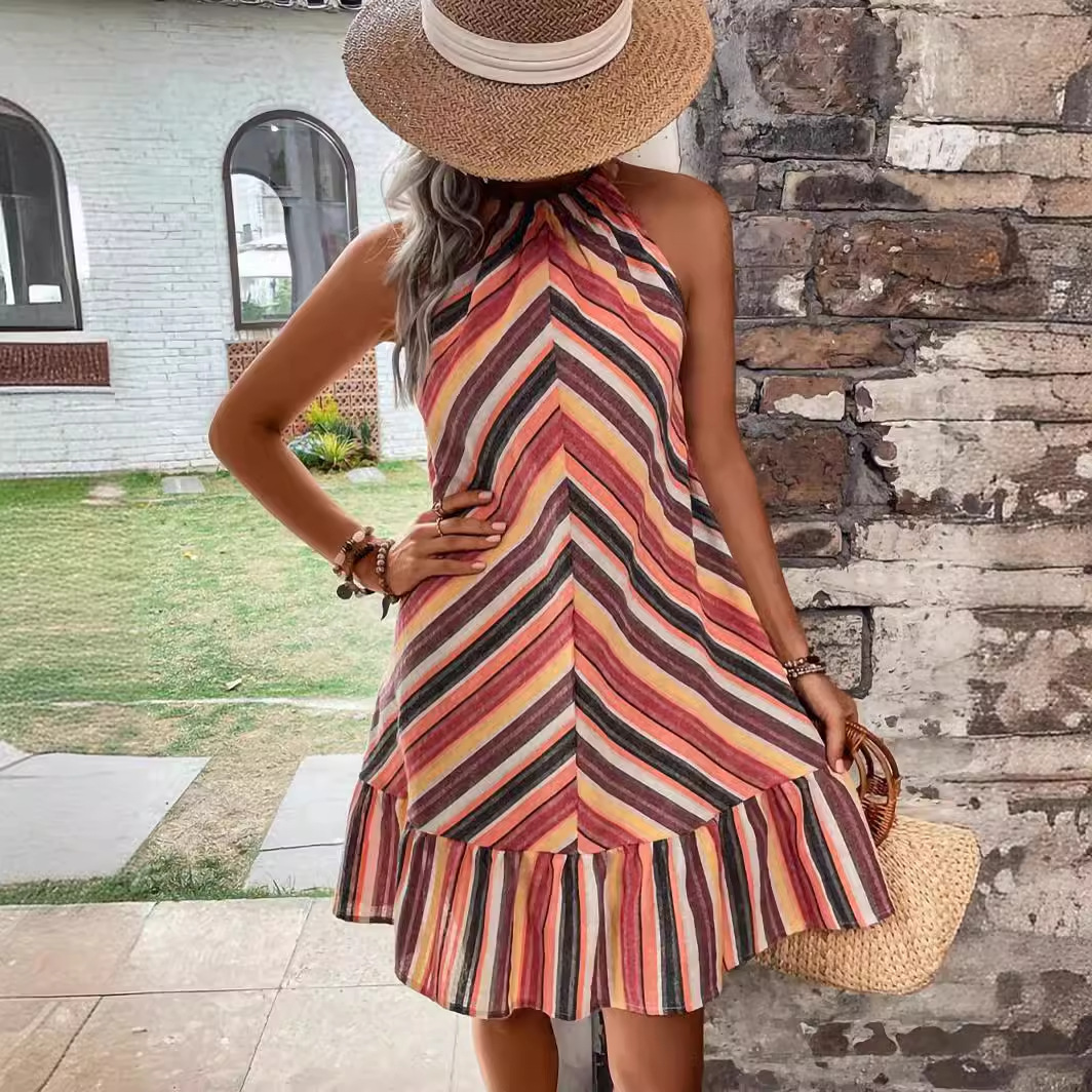 2024 summer new temu independent station European and American foreign trade women’s cross-border color striped neck rainbow dress