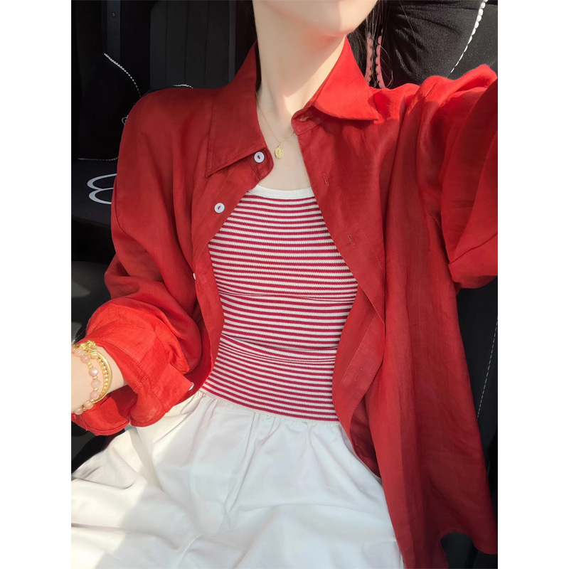 2024 Summer New Thin Red Cotton and Linen Sunscreen Cardigan Women's Loose Casual Holiday Korean Style Jacket