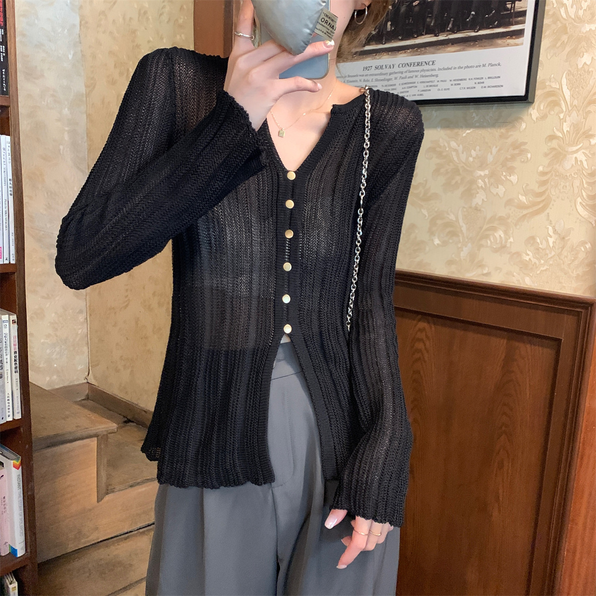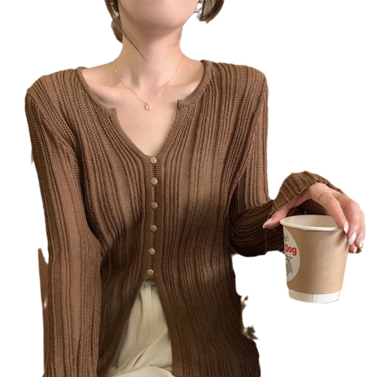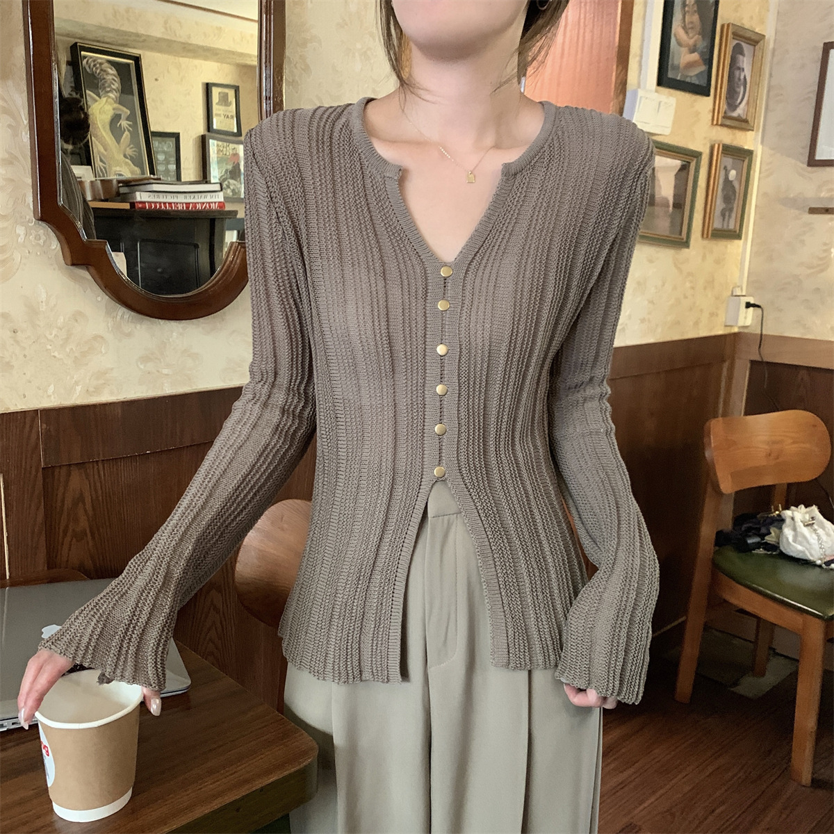| nameOriginal | 2024 Summer New V-neck Cardigan Cardigan Cardigan Cardigan Cardigan with Split Button Design Sense Niche Knitwear Long Sleeve Ice Silk Sun Protection Top |