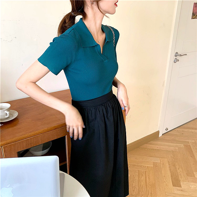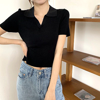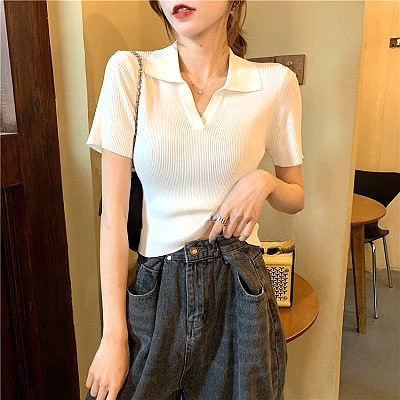 | nameOriginal | 2024 Summer New V-neck Polo Shirt Slim-fit Slimming Knitted Short-sleeved T-shirt Women's Design Sense Niche Short Top |